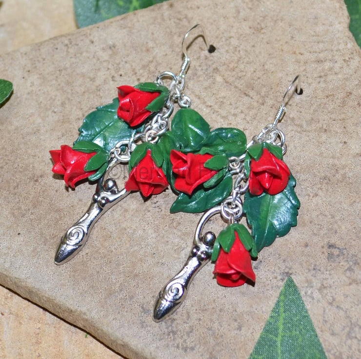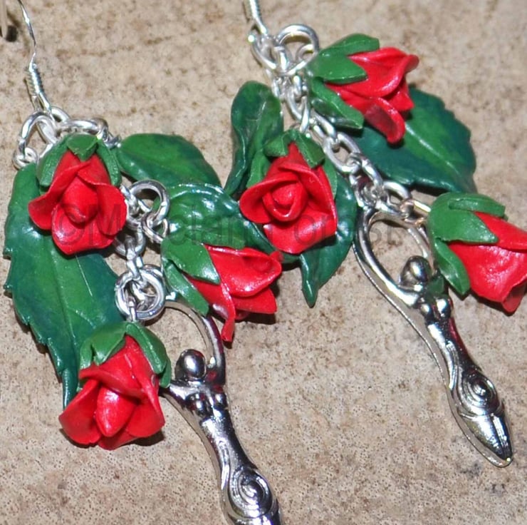 This listing is for a pair of Goddess Earrings with hand sculpted and painted Roses and Leaves.