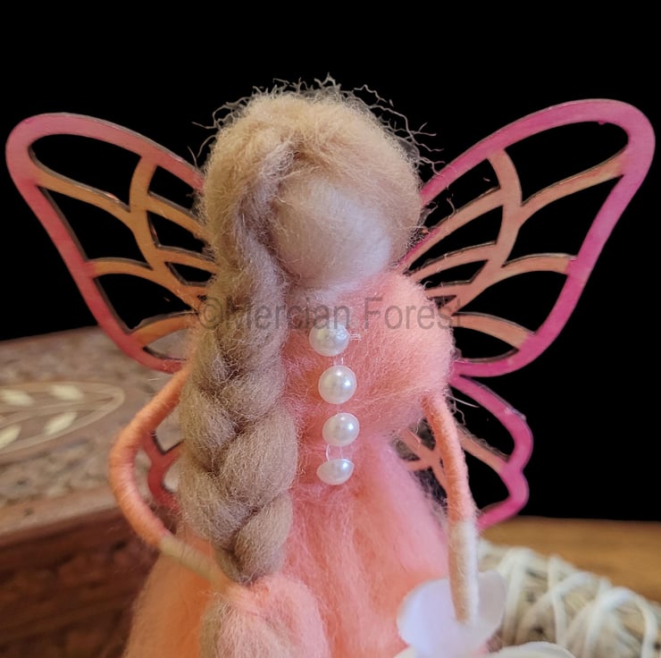 Our spring Fae has upright wings and wears a pink gown. She has a sprig of blossoms on her skirt. She has faux pearl buttons upon her chest and her hair is plaited into a braid.