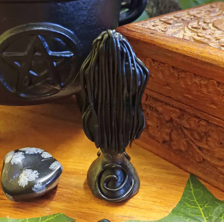 This dark goddess stands around 8 cm in height (please bear in mind each is crafted by hand and can vary slightly). She has a spiral at her feet - front and back and a spiral on her tummy. The figurine has been given a silver toned finish.