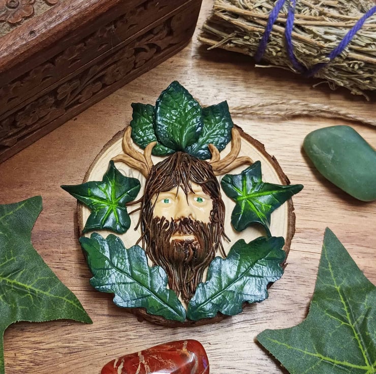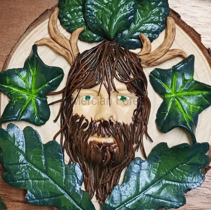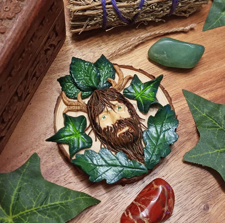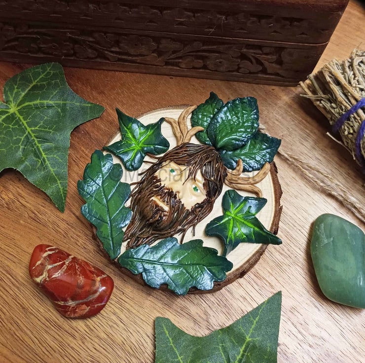 This horned god depiction (who could also represent Herne, who at Samhain leads the wild hunt) has been crafted from Polymer Clay. Leaf by leaf he has been sculpted entirely by hand and then carefully painted to add depth and contrast before being placed on a natural wooden disk that still holds the bark on the outer edge.