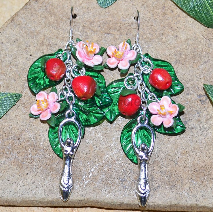 Hand crafted upon quality silver plated hooks, the earrings feature a selection of handmade apples and blossom, acrylic leaves and Tibetan silver goddess charms.
