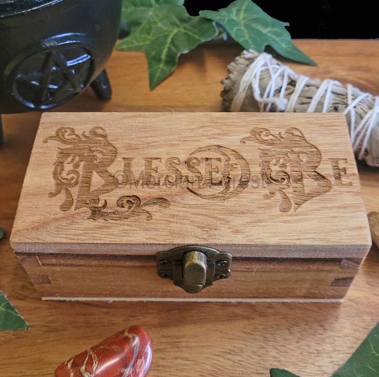 The wooden box measures approximately 11.5x5.5x4.5cm, with a bronze tone fastening and hinges, and features an ornate design of the words Blessed Be.
