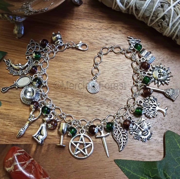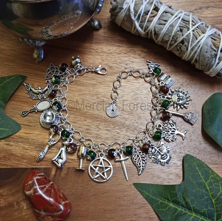 Hand crafted upon quality silver plated chain, the bracelet features 18 Tibetan silver charms, chosen for their relevance within many of the paths of the Wiccan faith, including a Cauldron, a Triquetra, Crescent Moon, Scrying Mirror, Teacup and saucer, Goddess, a Witches Familiar Cat, a Chalice, Pentacle, Athame, a Leaf, Green Man, Sacred Oak, Besom, Sun, Book of Shadows, Fire and a Spiral- each positioned to represent the balance, and duality of nature.
