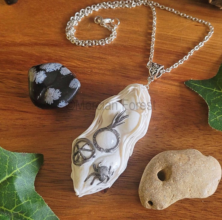 Handcrafted upon quality silver plated chain (available in sizes 18 inches through to 24 inches) the necklace features a White coloured Goddess sculpted from Polymer Clay, set within her belly is a Moonstone gemstone. Arianrhod is the Lady of the Silver Wheel, a goddess of time and fate, mistress of the other world (land of the dead, where Arianrhod ruled over the cycles of death and rebirth) and lady of the stars.