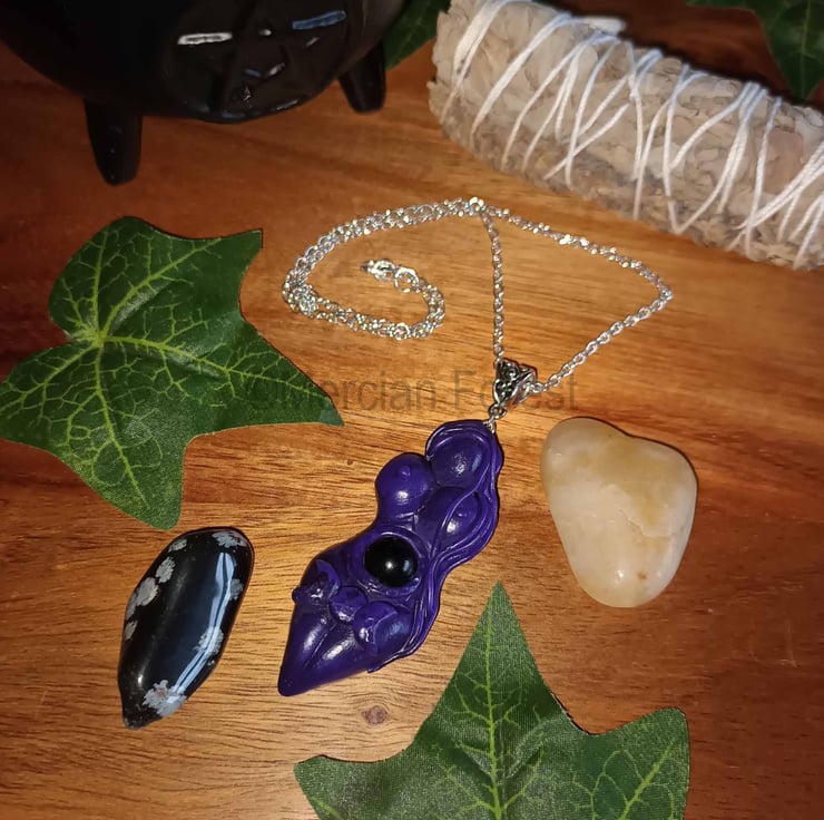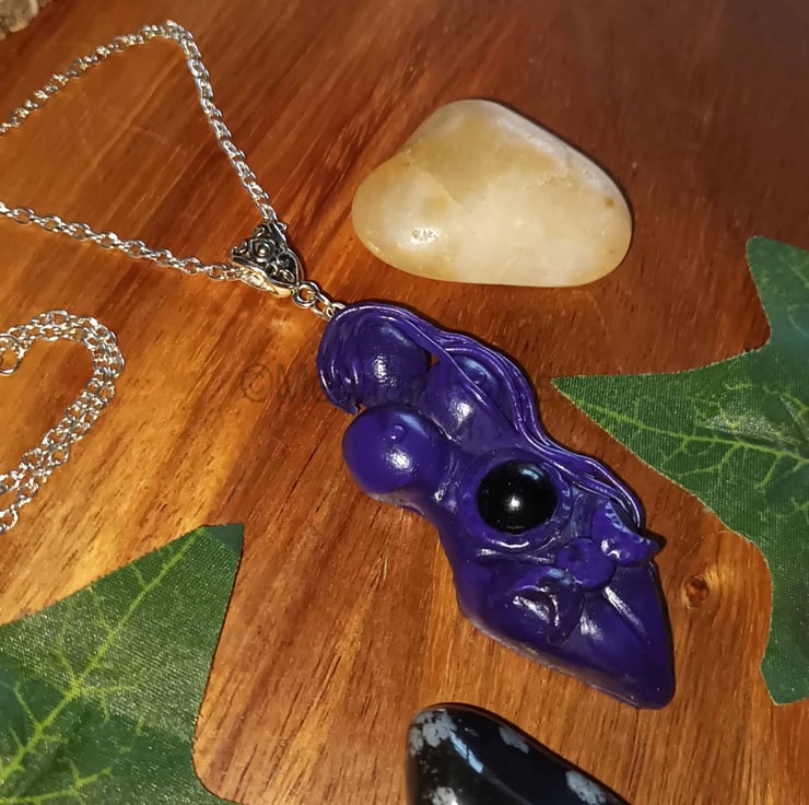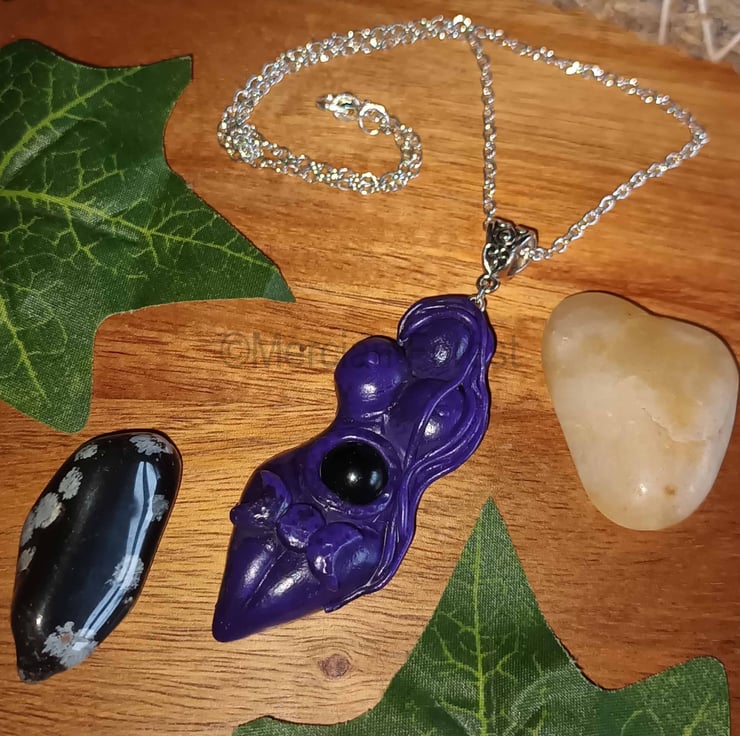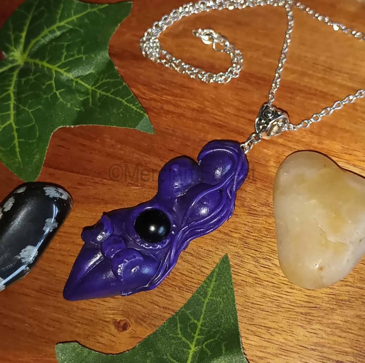 Handcrafted upon quality silver plated chain the necklace features the Hecate goddess, crafted in purple clay with a Onyx bead embedded inside her tummy. Hecate has a triple Moon underneath the gemstone the triple moon indicating the triple aspect of the goddess as Maiden, Mother and Crone.