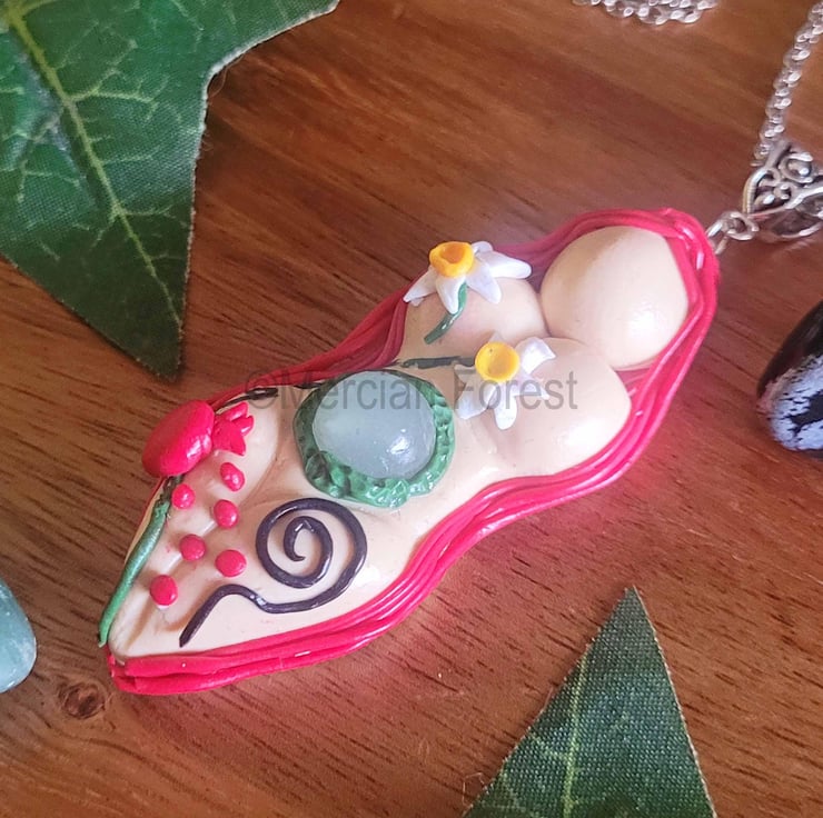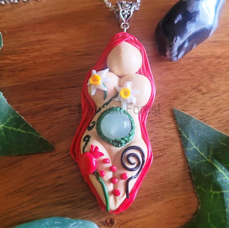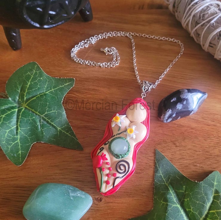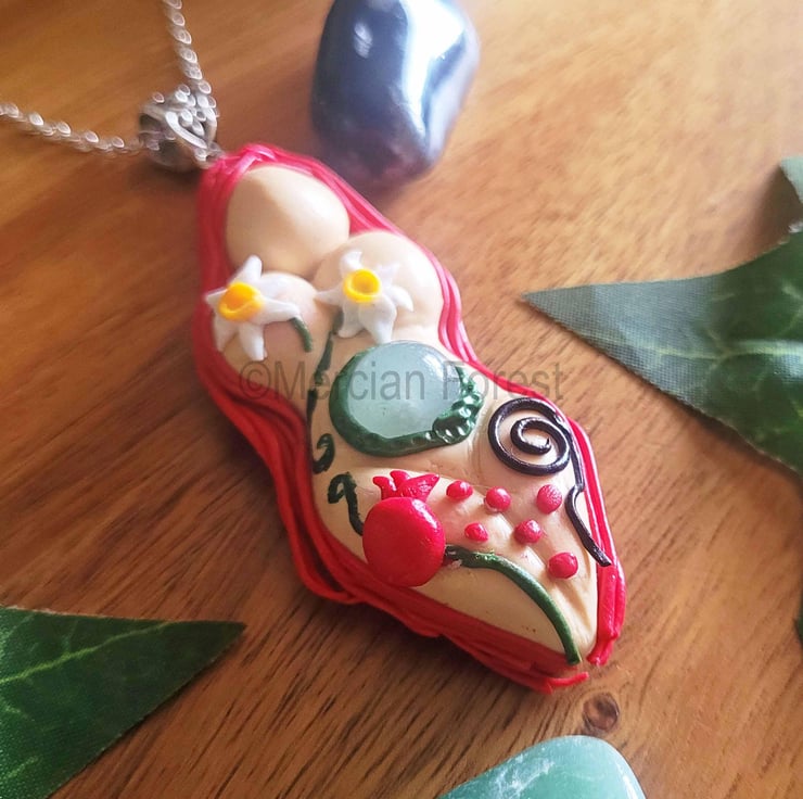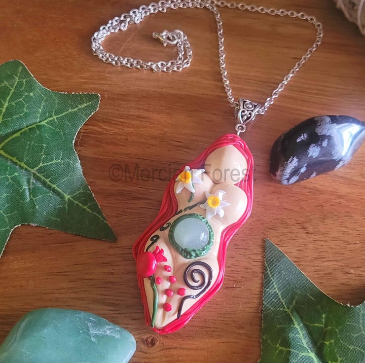 Handcrafted upon quality silver plated chain the necklace features a Goddess sculpted from Polymer Clay.
