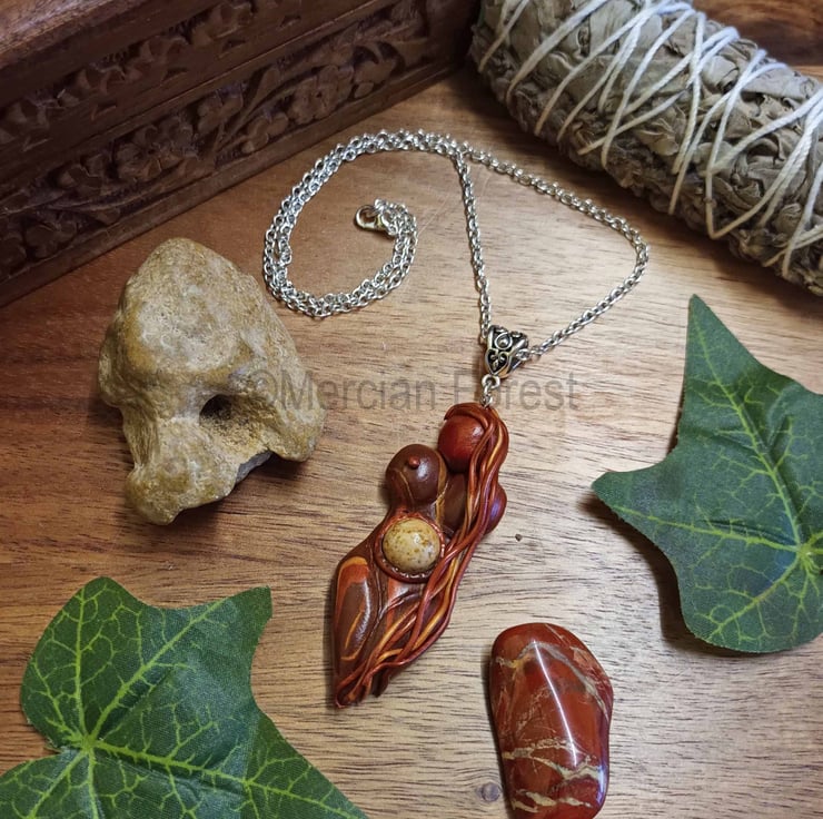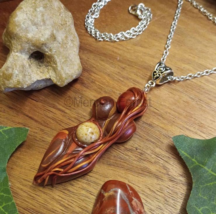 Handcrafted upon quality silver plated chain the necklace features the Autumnus goddess, crafted in Autumnal tones her long hair flowing down softening her overall look. A Picture Jasper bead is embedded inside her tummy.