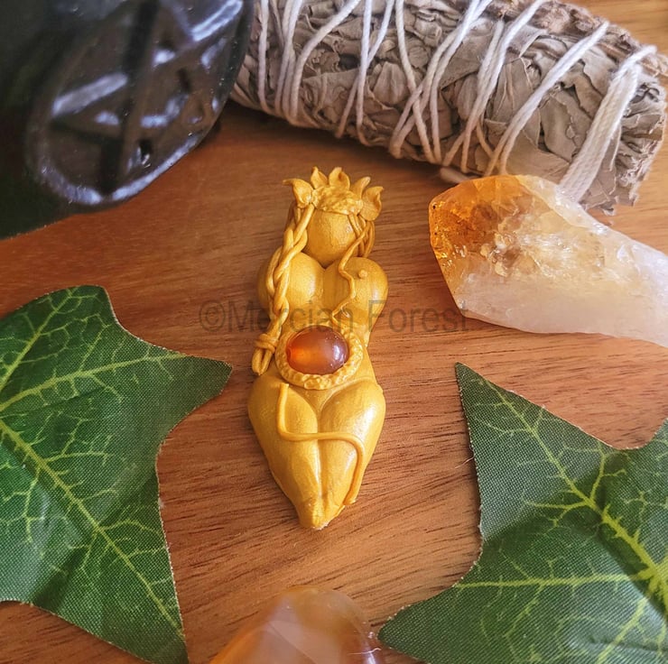 This golden clay Goddess is sculpted from Polymer Clay. Set within her belly is a round Carnelian Gemstone Bead. Her hair is tied in a plait and upon her head sits a Sun crown, across her thighs is the rune Sowilo its meaning simply 'the sun'.