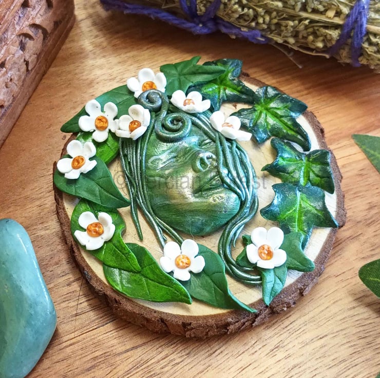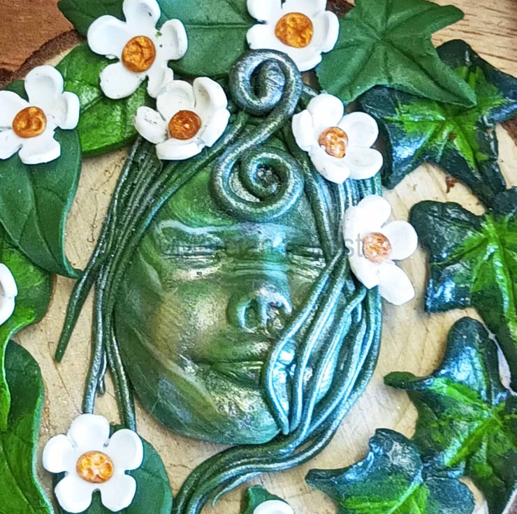 This Green woman has been crafted from Polymer Clay, Leaf by leaf and flower by flower she has been sculpted entirely by hand and then carefully painted to add depth and contrast before being placed on a natural wooden disk that still holds the bark on the outer edge. This Green woman is surrounded by Hawthorn flowers rich in folklore and very prevalent at Beltane.