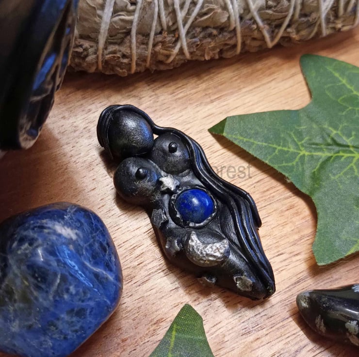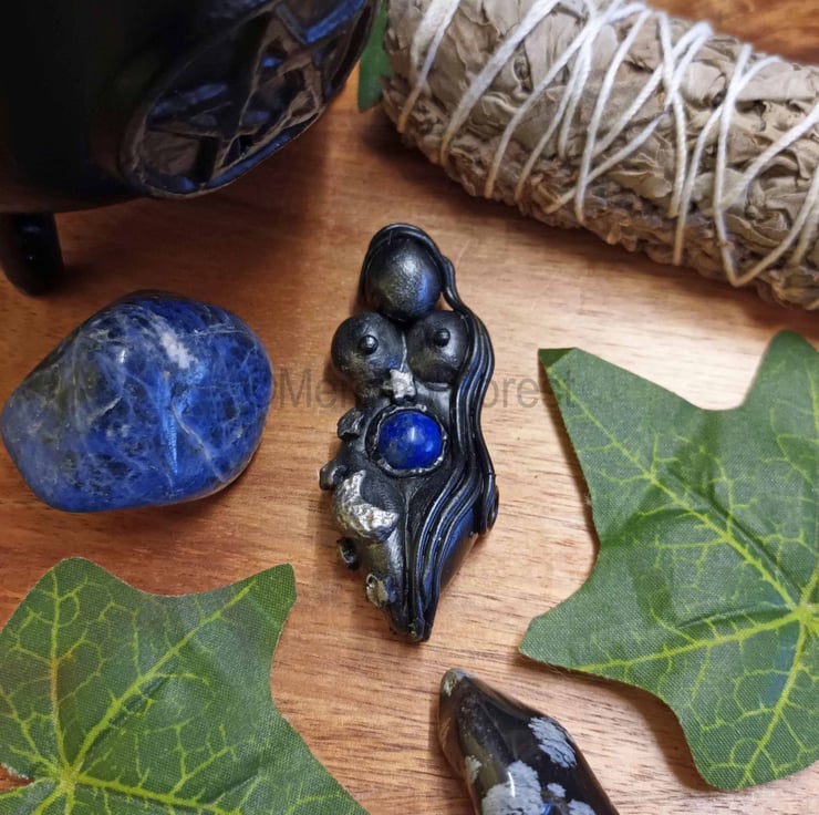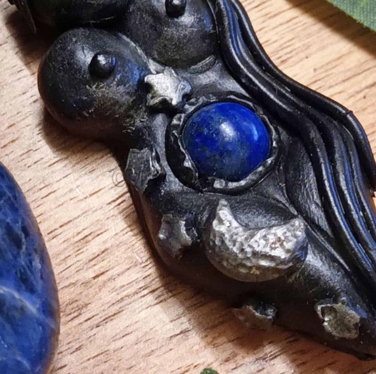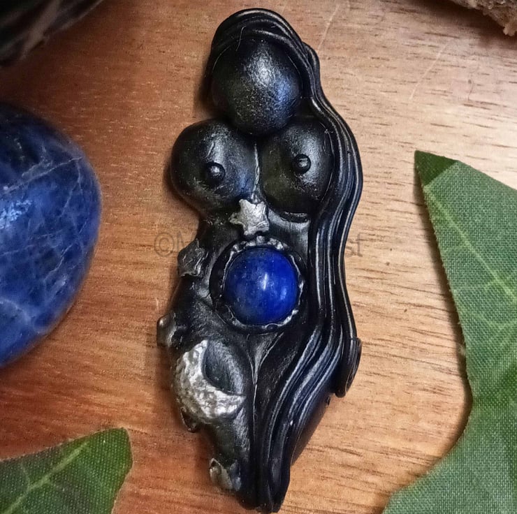 Nyx measures around 6 cm in height. A crescent moon sits upon her thigh, with small stars dotted around her and long hair flows down softening her overall look. A Lapis Lazuli bead is embedded inside her tummy.