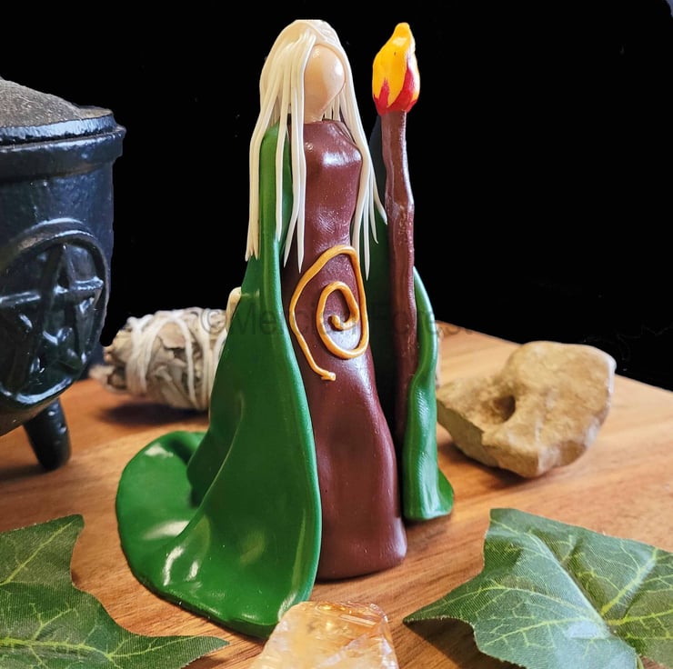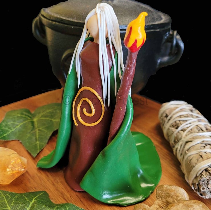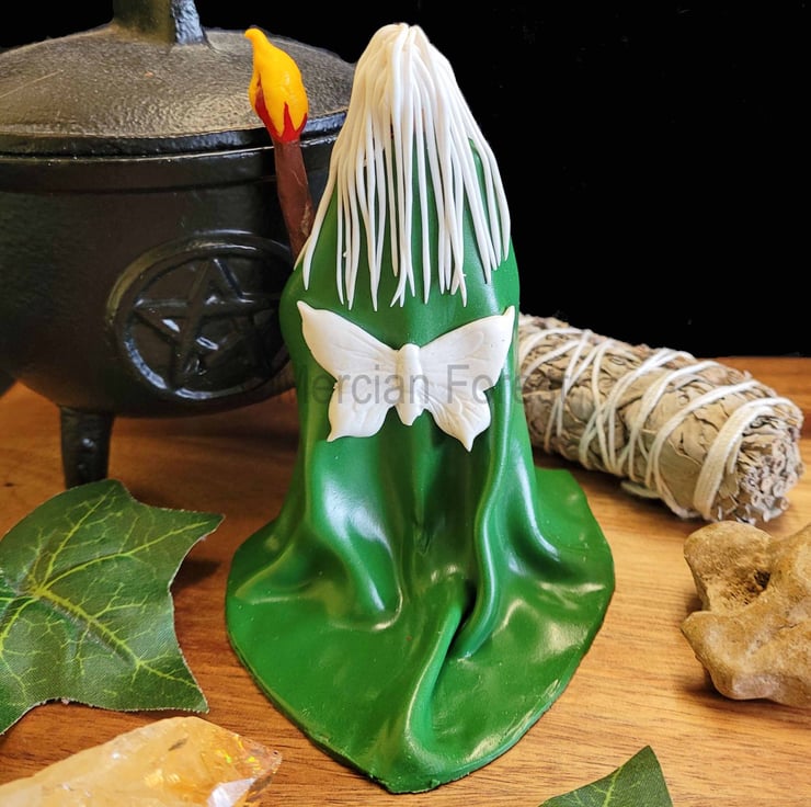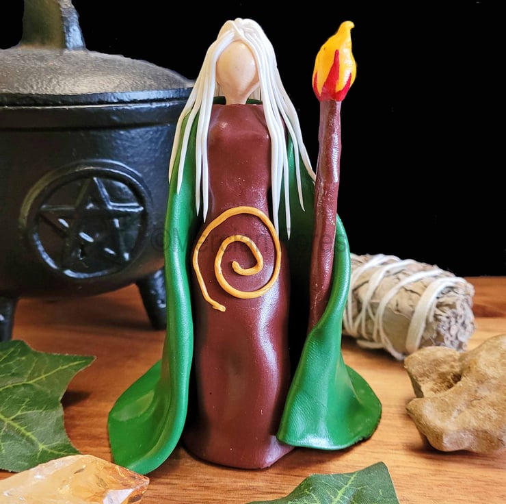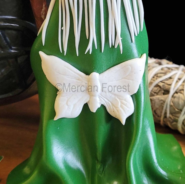 This goddess wears a brown dress with a continuous spiral at the front (symbolising life, death and rebirth in a continuous cycle), a green cloak hangs from her shoulders and a White butterfly is emblazoned on the back (symbolising growth, change and transformation). Our goddess has long flowing white locks symbolizing the wisdom of crone-dom. Her torch lights the way on her path.