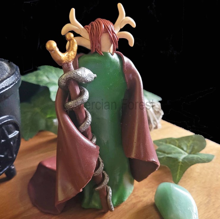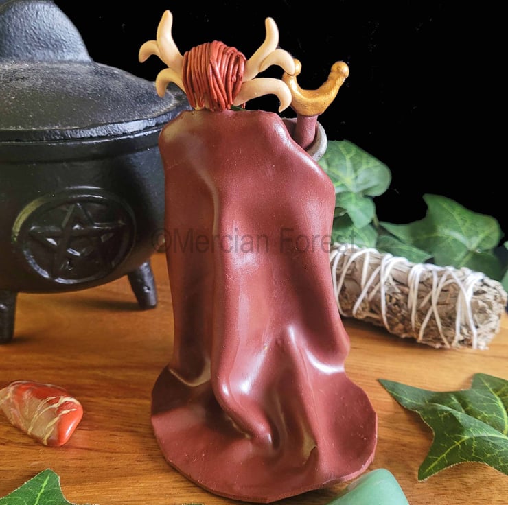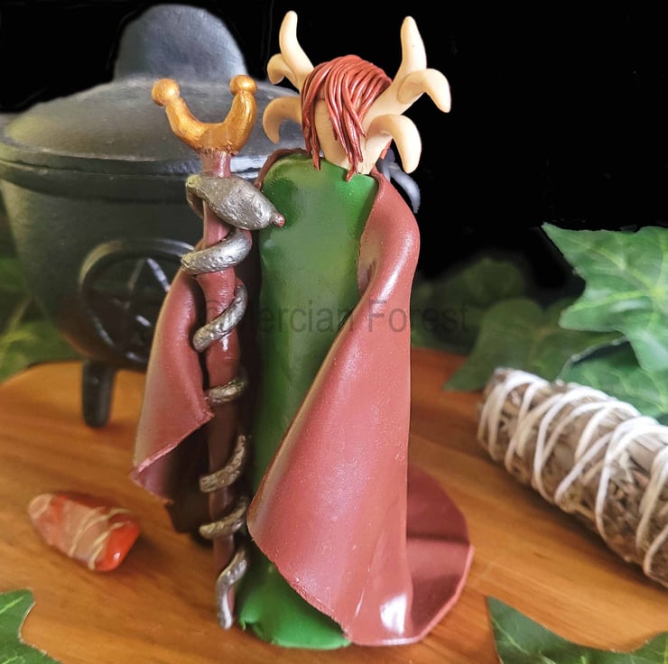 This stunning figurine has been hand crafted by ourselves using polymer clay, and features the antlered pagan god Cernunnos, wearing ceremonial robes, a cloak and holding a rattle topped staff with a snake wrapping around it.
