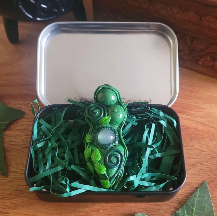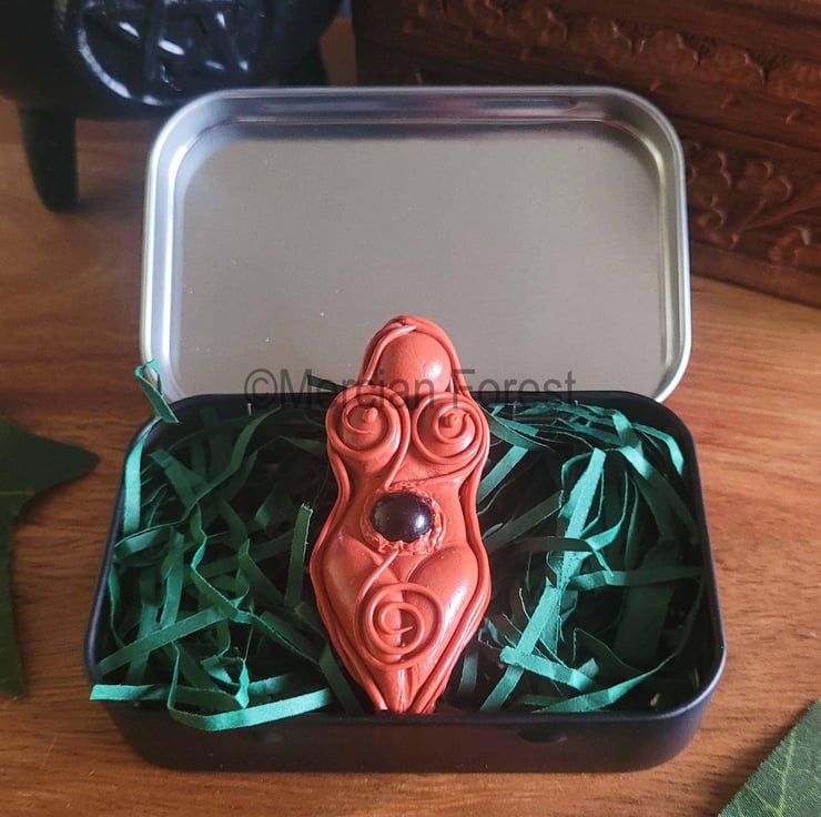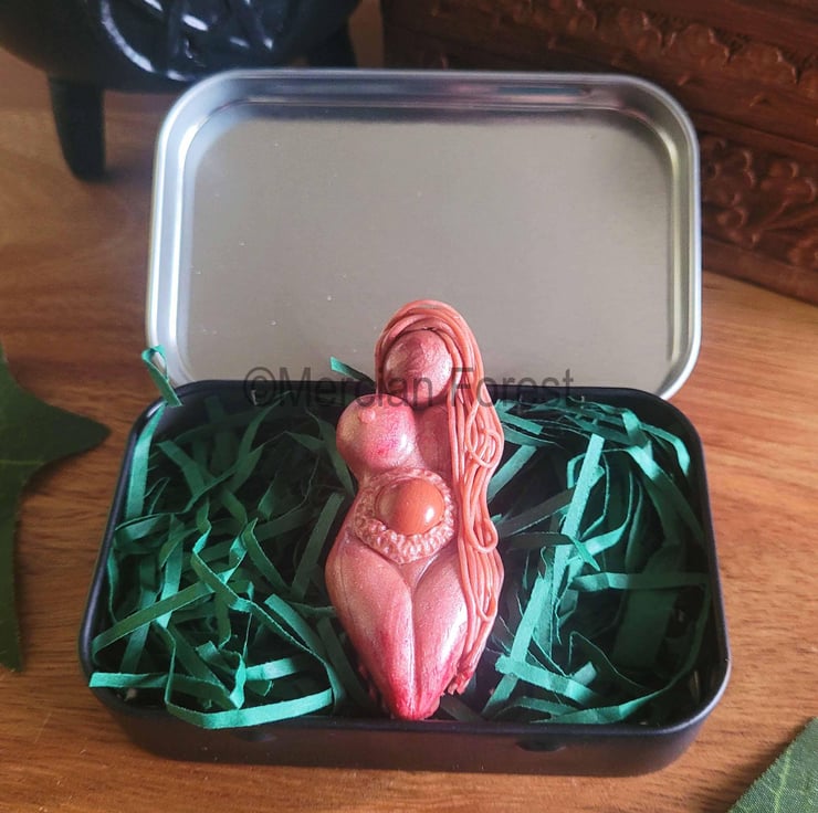 This listing for a beautiful engraved Triple Goddess Tin, complete with one of our hand sculpted Polymer Clay altar Goddesses.