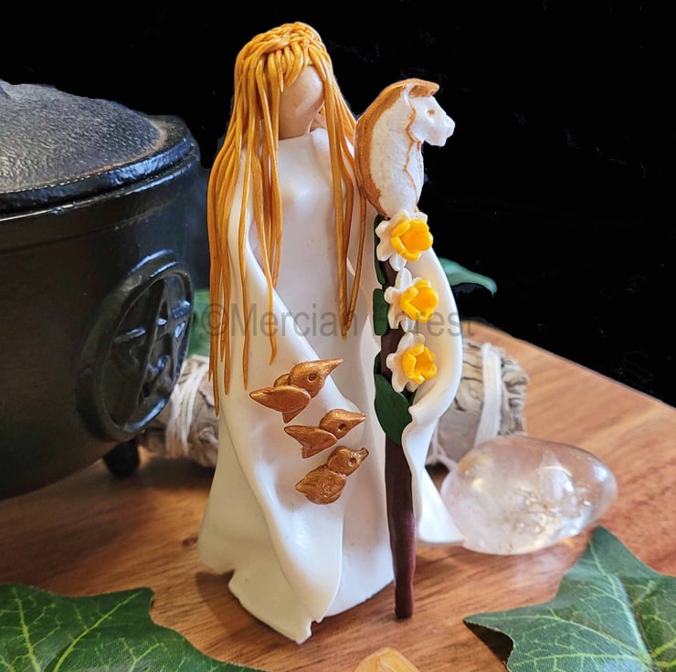 Rhiannon has 3 magical birds that can sing humans to sleep and wake the spirits from the underworld. She is often described as wearing white or gold and rides a white horse. Due to her celtic welsh heritage she is also associated with Daffodils and narcissus.