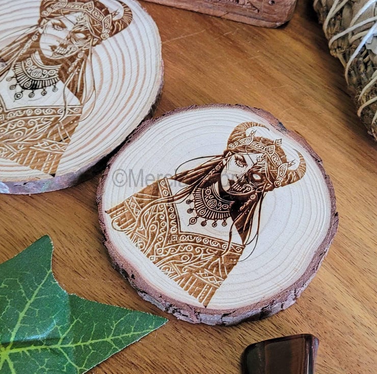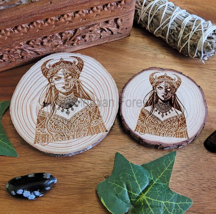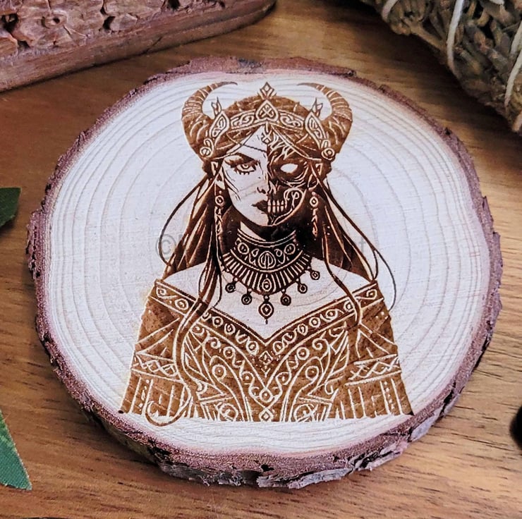 This listing is for an altar tile depicting Hel. In Norse mythology Hel or Hela is the daughter of Loki and the giantess Angrboda. Her brothers are Fenrir the Wolf and Jormungandr the World Serpent. Hel reigns over the realm of the dead in Helheim or Underworld.