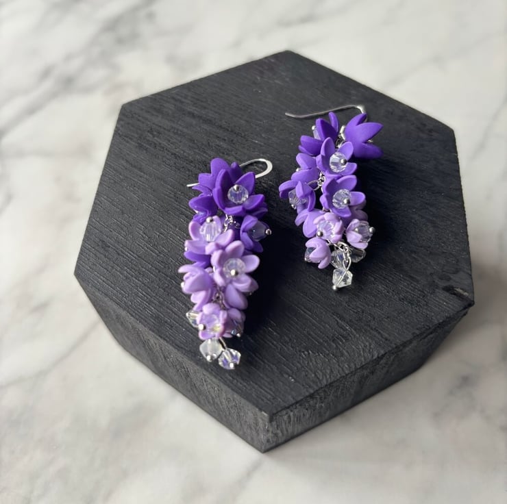 To add extra sparkle, I’ve incorporated faceted crystals between the blooms, catching the light with every turn of your head. The flowers are securely attached to fine silver-plated wire and hang delicately from sterling silver ear wires, making them lightweight and comfortable enough for all-day wear.