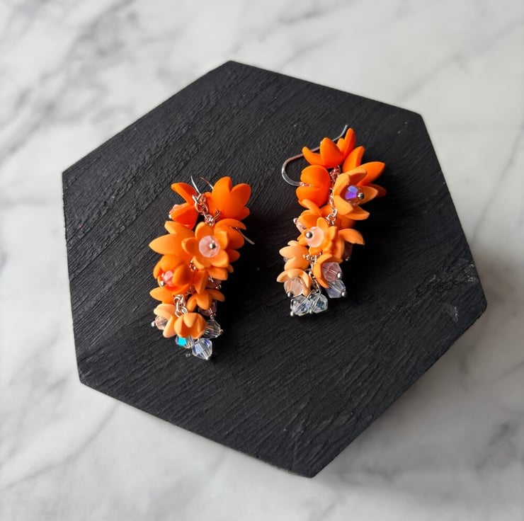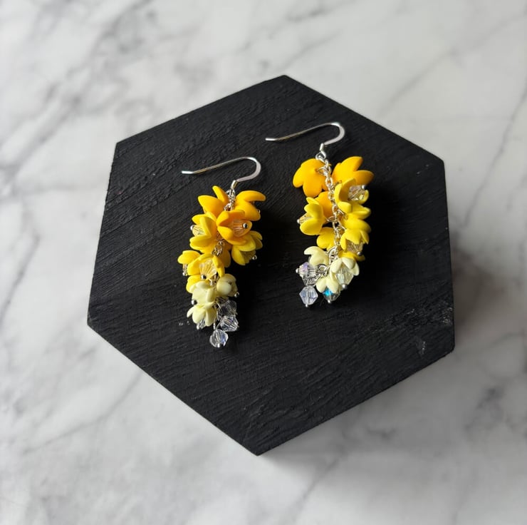 Each flower is lovingly handmade from polymer clay using my own custom-blended colours, ranging from bright tones to pastel shades. No two are exactly alike, making every pair completely one of a kind. The tiny petals are shaped and arranged to create a flowing, cascading effect, as though the flowers are dancing in a breeze.