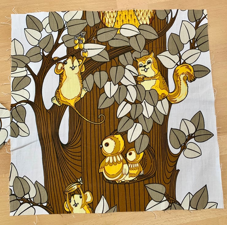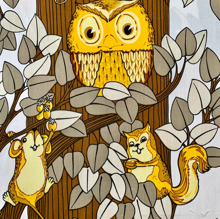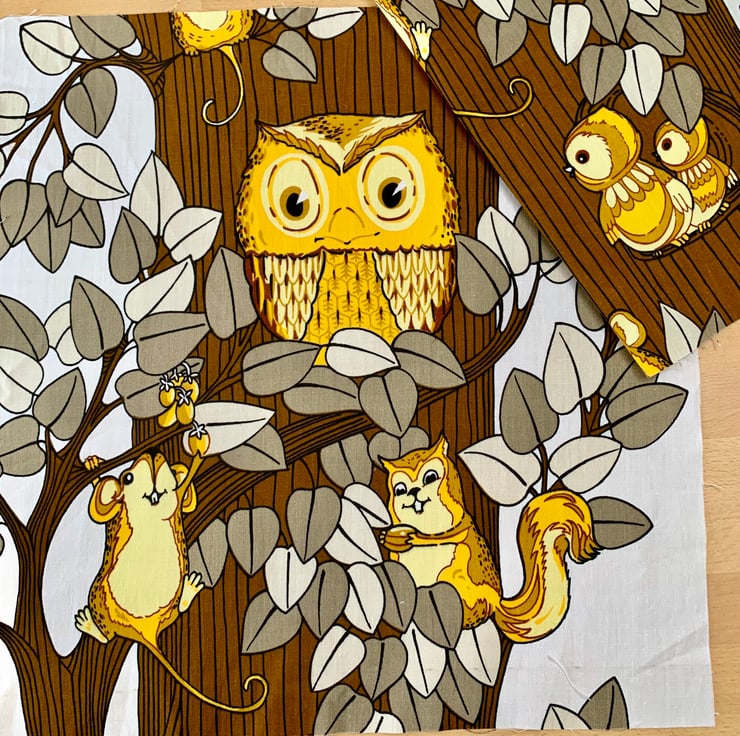 One piece of fabric shows an owl, the other mice/birds/squirrels - this fabric is called 'Sherwood' by Duro