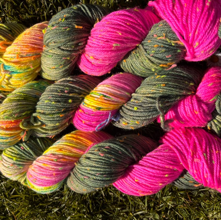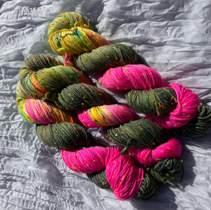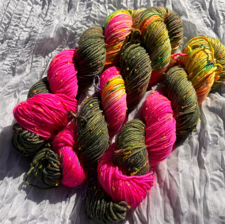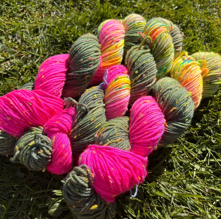 I am so in love with how this colour turned out. It is a dip dyed fade going from khaki to neon pink with some gorgeous vibrant speckles. I have dyed this up on Neon nep base.