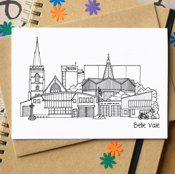 A blank card featuring a skyline illustration of some of the Liverpool district of Belle Vale's most iconic landmarks.