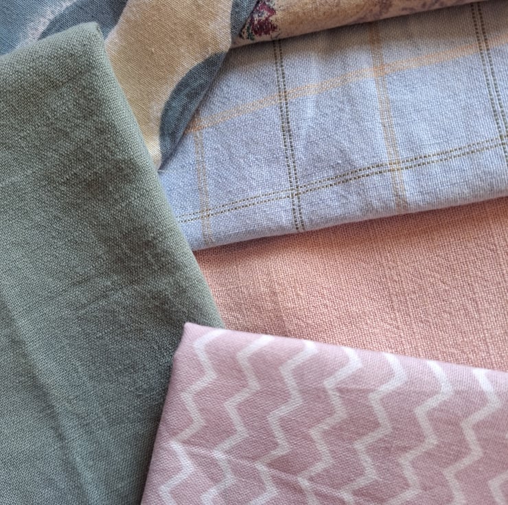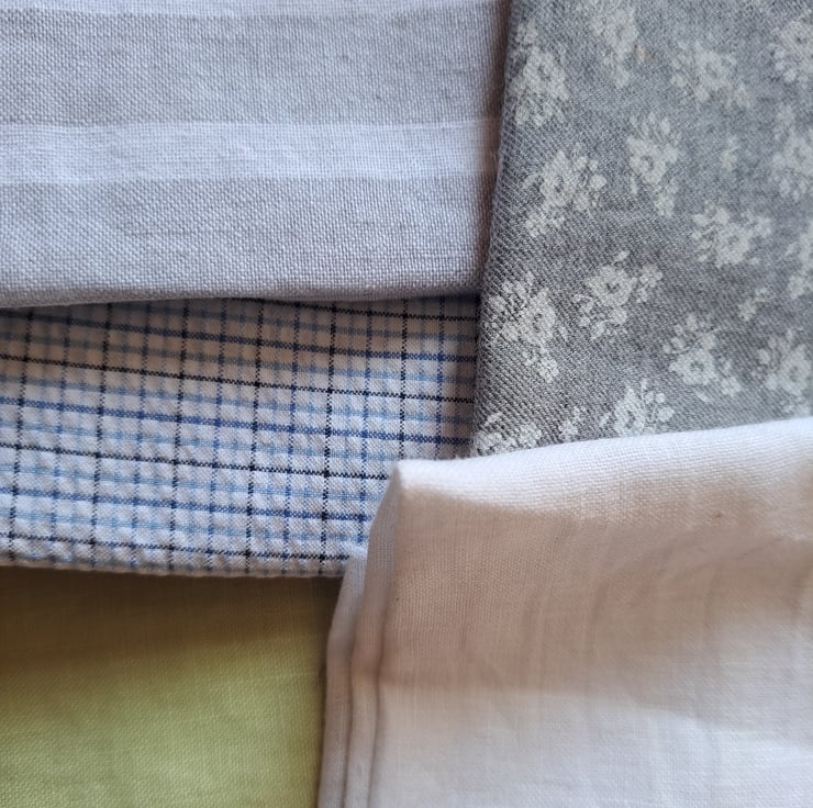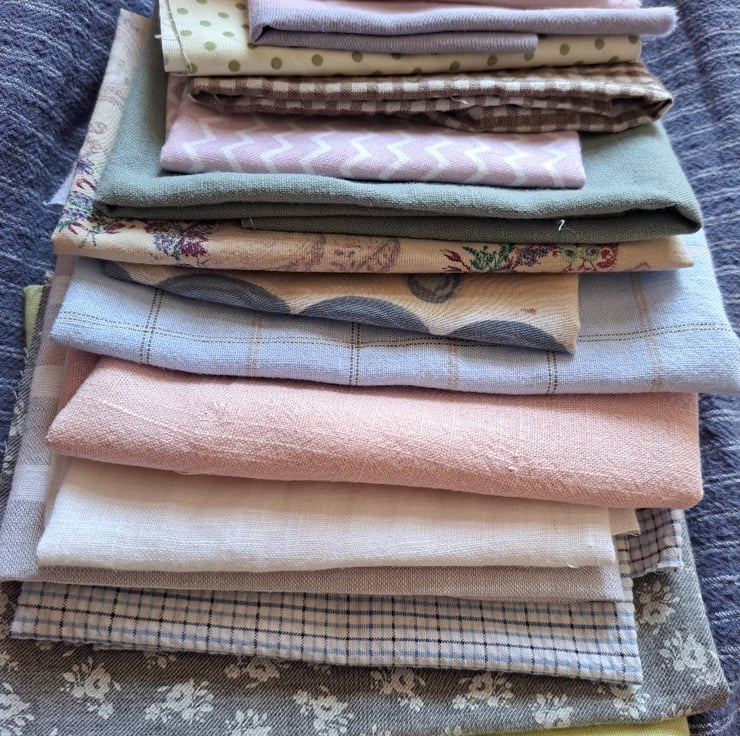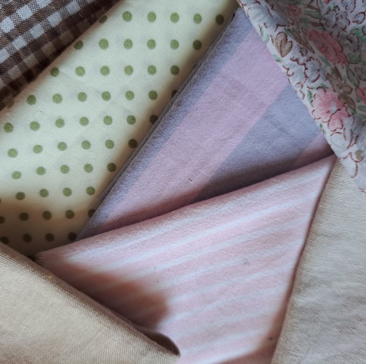 Not a shouter, this one. Eighteen quiet but lovely pieces of rescued or remnant cotton or linen, in pale shades of lavender, pink, beige, yellow and white. Hushed tones.