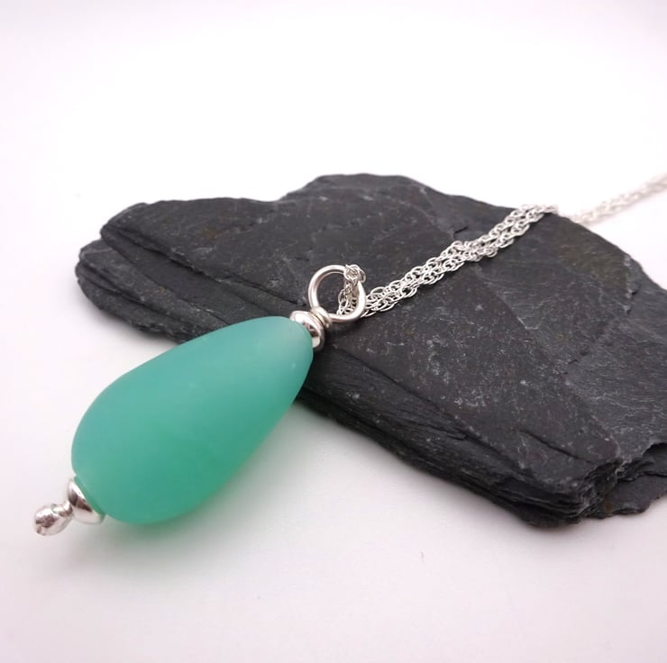 A sterling silver chain necklace which features a handmade lampwork glass aqua green frosted pendant in the shape of a teardrop.