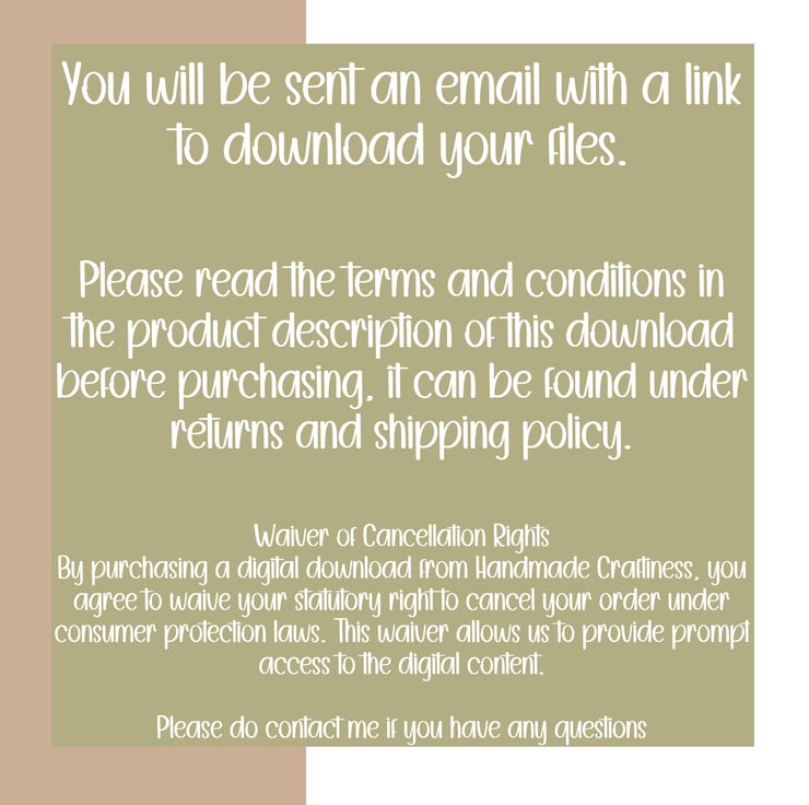 No Refunds for Digital Downloads Refund Policy for Digital Downloads Acceptance of Terms By completing your purchase, you acknowledge and accept this refund policy. At Handmade Craftiness, we are committed to providing high-quality digital products. Please read our refund policy carefully before making a purchase: Waiver of Cancellation Rights By purchasing a digital download from Handmade Craftiness, you agree to waive your statutory right to cancel your order under consumer protection laws. This waiver allows us to provide prompt access to the digital content. No Refunds After Download For digital downloads, consumers are required to waive their cancellation rights before the digital content can be provided. This means that once a customer (i.e., the consumer) has downloaded the content, they have given up their consumer rights to a refund. This policy aligns with consumer law for digital goods, ensuring the protection of intellectual property and preventing unauthorized distribution. Cancelling a Digital Download Under the Consumer Contracts Regulations 2013, digital downloads are neither goods nor services, meaning the law is a little different. If you want to download something within 14 days of buying it (known as the 'cooling-off’ period), you must give your consent to waive the 14-day cooling-off period. If you do not give your consent, the 14-day cooling-off period still applies. However, you will not be able to download your digital content until this period has ended. This policy exists to prevent customers from changing their minds after downloading the content. As you are being sent a link via email to download after purchase this will count as downloading the content as you will have access to download the files from the email. Eligibility for Refunds Refunds may only be issued under exceptional circumstances, such as: The digital content is proven to be defective or incomplete. An error on our part (e.g., duplicate billing). Contact Us If you believe you are eligible for a refund due to one of the exceptional circumstances above, please contact us at orders@handmadecraftiness.co.uk with your order details, a description of the issue, and proof of purchase. Our team will review your request and respond within 7 business days. For further inquiries, please contact us at orders@handmadecraftiness.co.uk. ------------------------------------------------------------------------------------------------------------------------------------------------------------- Ownership and Usage: All artwork within this shop is the exclusive property of Handmadecraftiness. You are expressly prohibited from reproducing, altering, redistributing, reselling, or claiming ownership of any digital item from this store. However, you are permitted to incorporate products from this store into your own physical handmade items for sale as a hobbyist. TERMS OF USE 1. You may print and use these items in a tangible journal/scrapbook/craft project etc. 2. You MAY NOT sell or share these files. 3. You MAY NOT reproduce/alter/redistribute our designs as a digital or physical item. 4. You MAY NOT sell or manipulate these files for resale purposes. 5. You MAY NOT share these files individually or as kits.