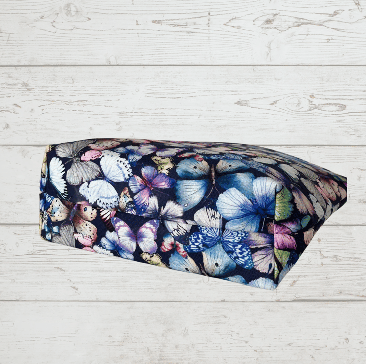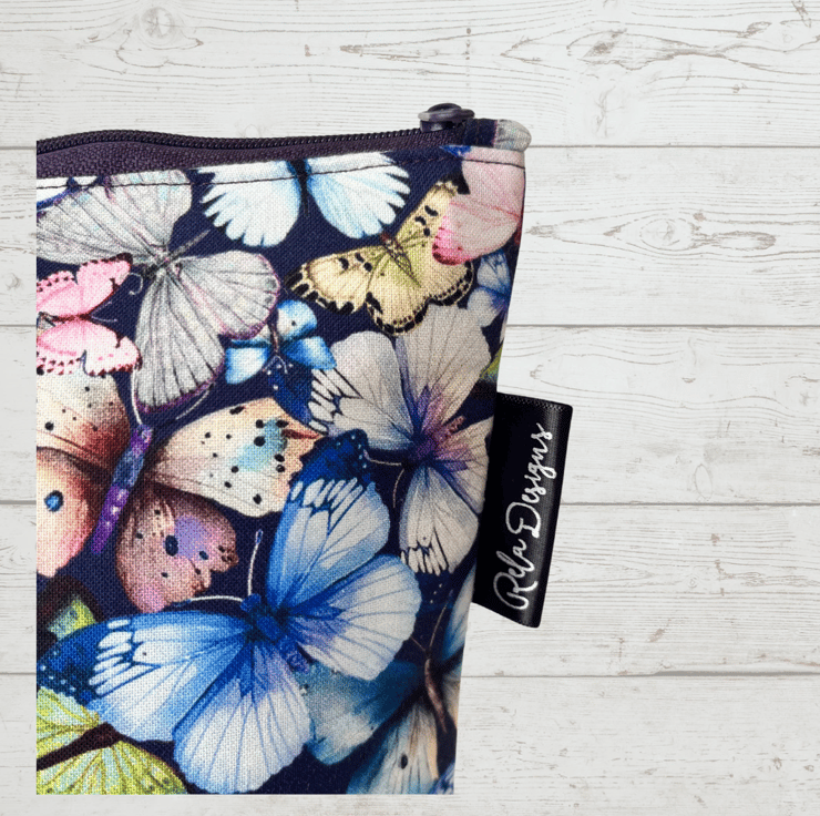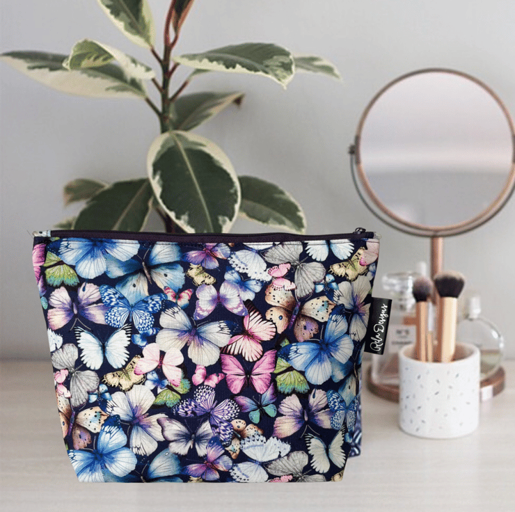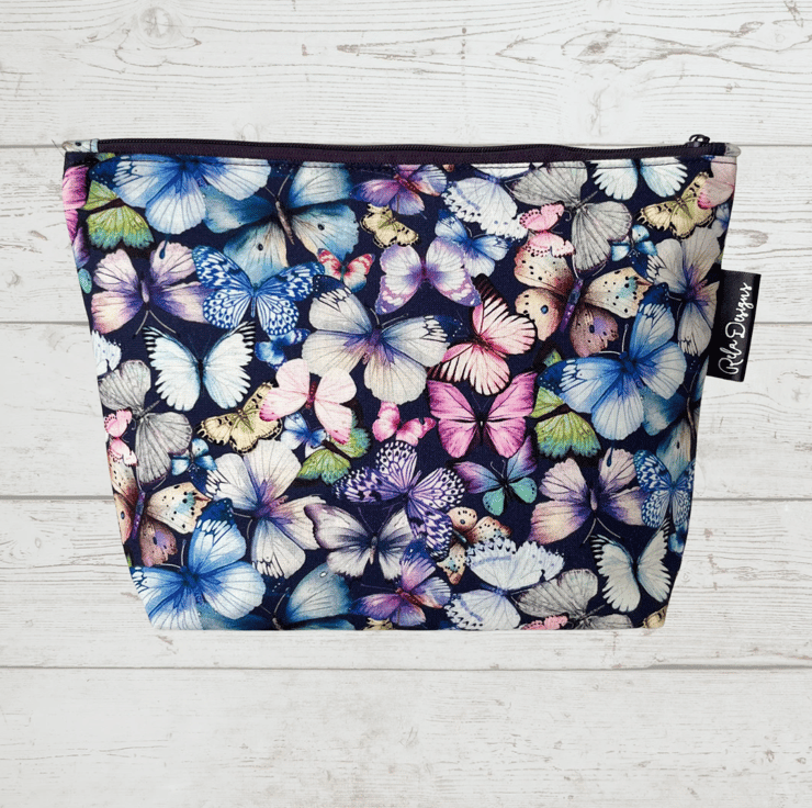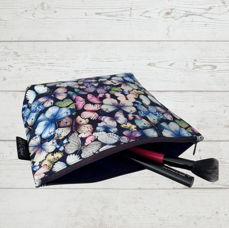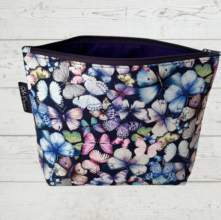 This gorgeous butterfly print cotton zipped pouch has a purple waterproof nylon lining , great for those inevitable spills.