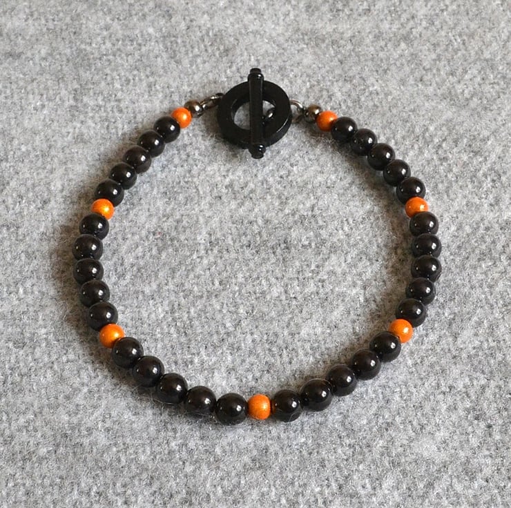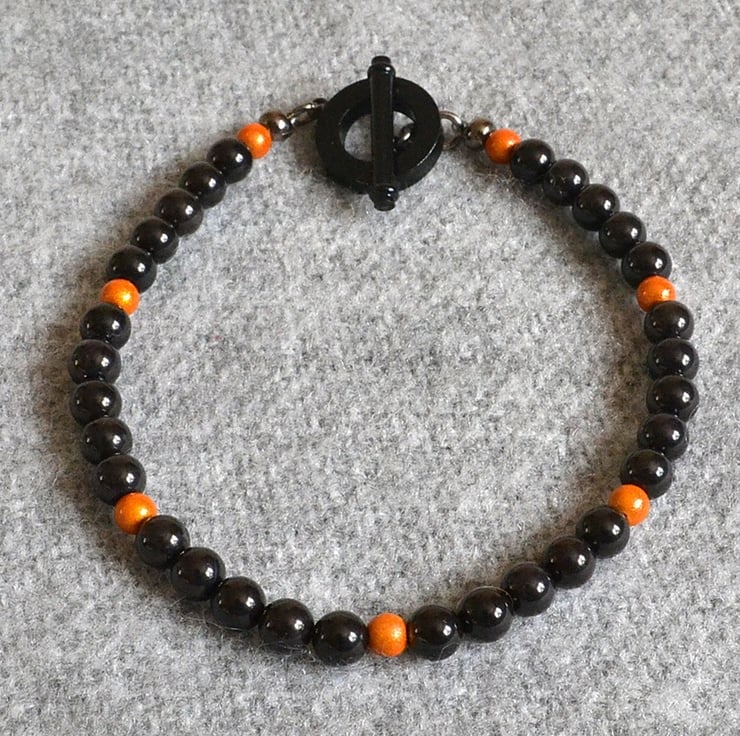 Made with shiny black glass beads and reflective 3mm orange miracle beads, strung on beading wire and finished with a thick black toggle clasp. This bracelet has a bit of a Halloween feel, but is a stylish year-round addition. It’s a looser adult style, measuring 8 1/2 inches.