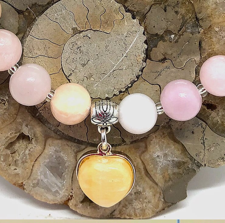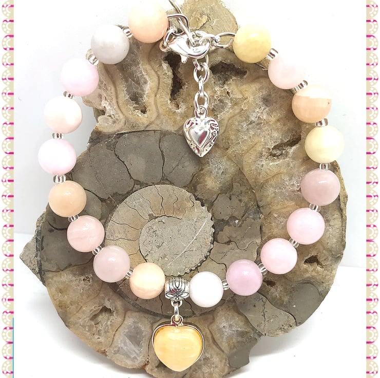 Created using this gemstone heart in a silver plated tray, with a Tibetan silver connector with 8 mm multi coloured jade beads threaded onto memory wire finished with a lobster clasp & extension chain. Nickel free