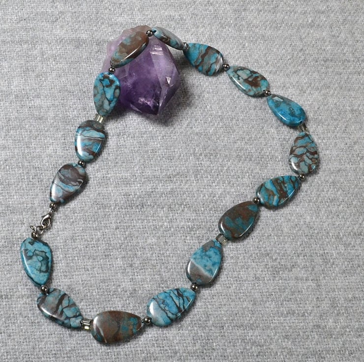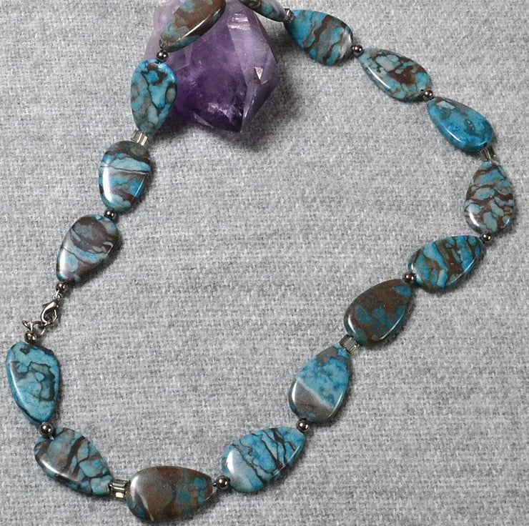 This necklace is made with colour manipulated natural stones, which means there will be natural variations, flaws, and imperfections in the stones. It is approximately 48cm, or 19 inches, in length and finished with a gunmetal tone clasp.