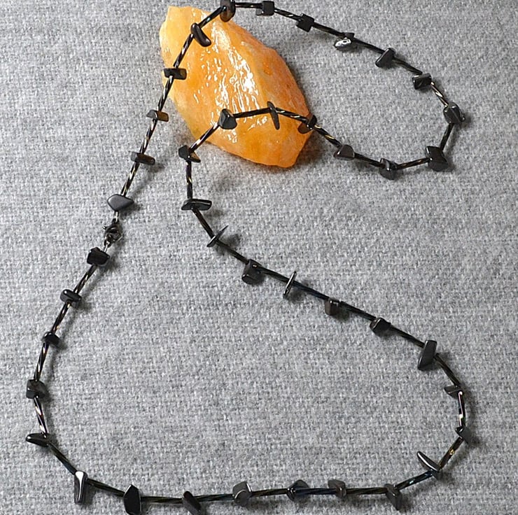 This slender necklace, featuring small chips of hematite and twisted dark bugle beads with a rainbow sheen, is beautifully reflective. It’s a long and lightweight piece, measuring approximately 25 inches, which would pair well with a brightly coloured top.