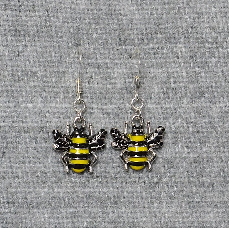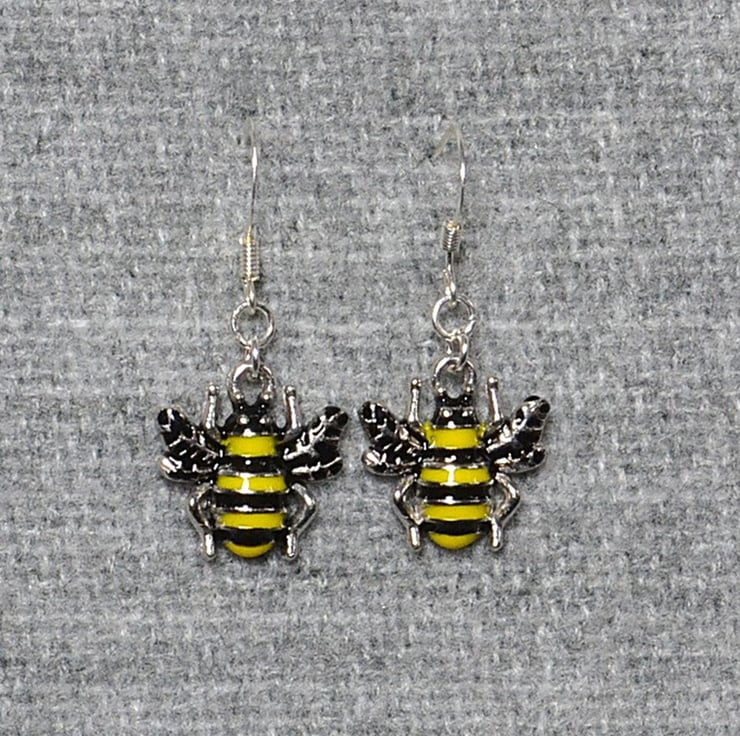 These adorable bee charms are hung on silver-plated ear wires and hang approximately 22mm.
