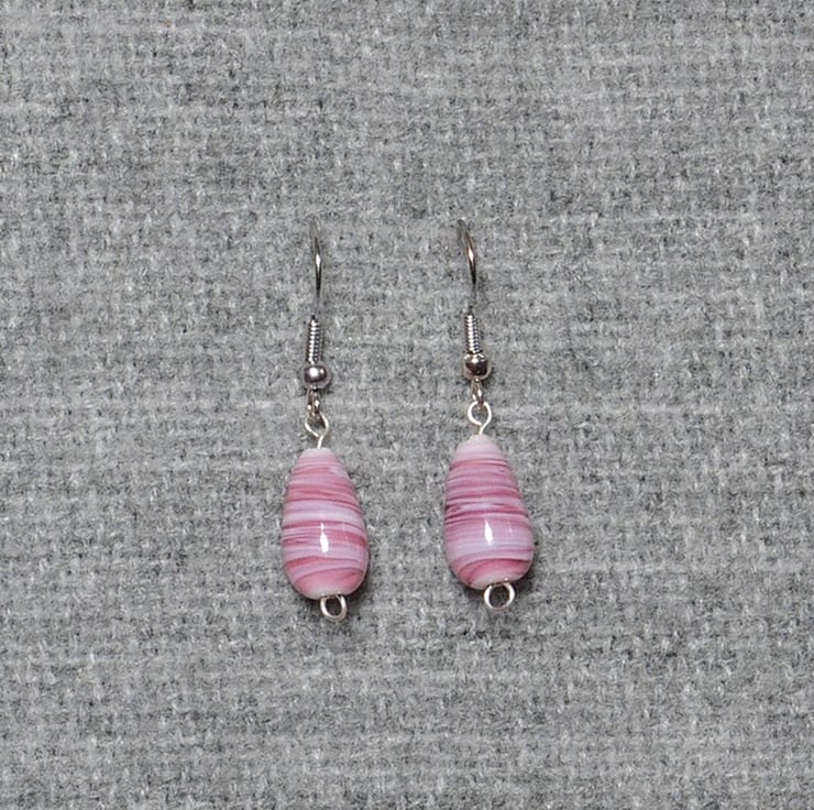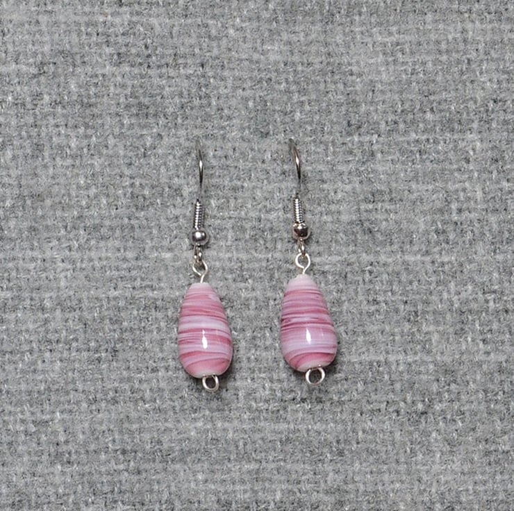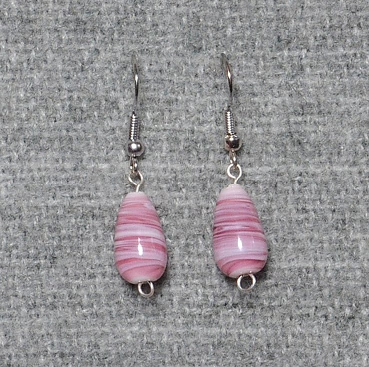 Pretty glass drop beads, swirled in pink and white, are wire looped and hung on siler plated ear wires. They hang approximately 20mm.