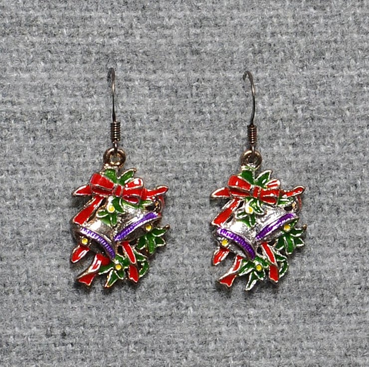 These pretty charms feature Christmas bells with mistletoe and ribbons. They’re hung on Steel ear wires and hang approximately 23mm.