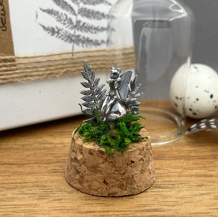 Gorgeous sterling silver fairy resting on a toadstool surrounded by ferns on a bed of moss. The silver is oxidised to enhance the details and textures.