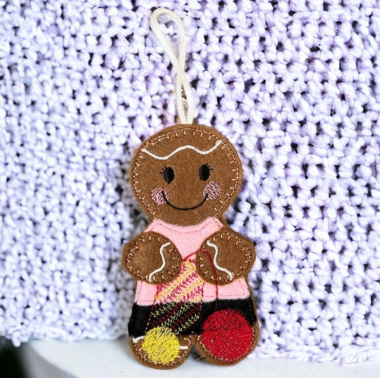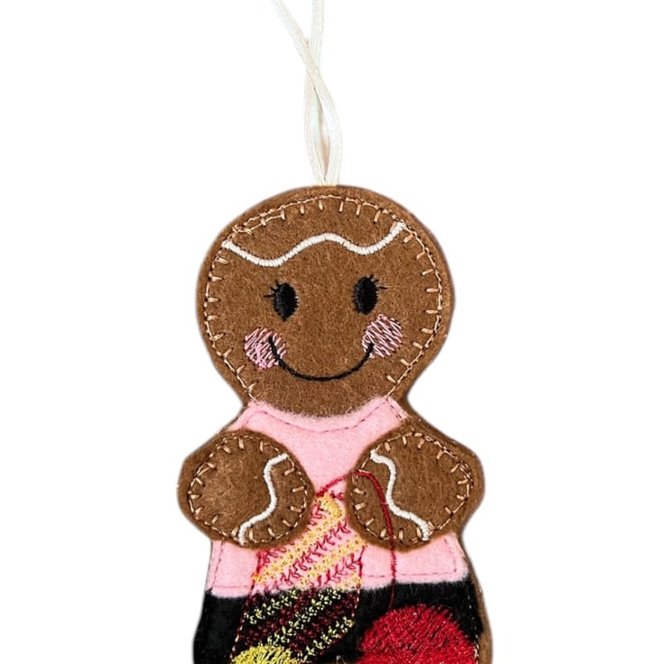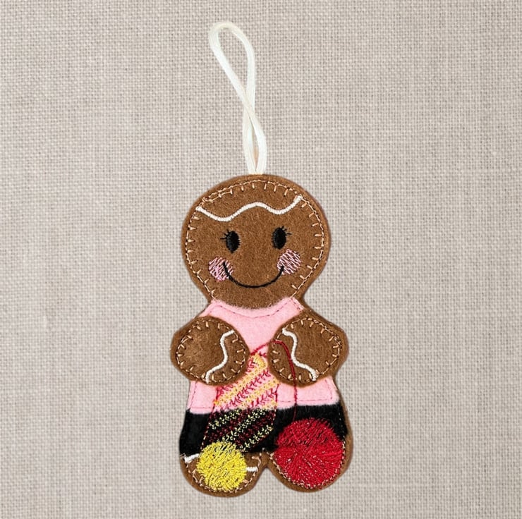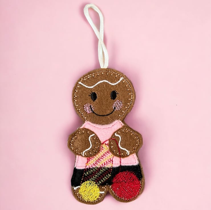 Gingerbread lady doing some crochet Embroidered Hanging Keepsake