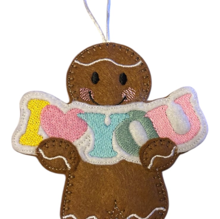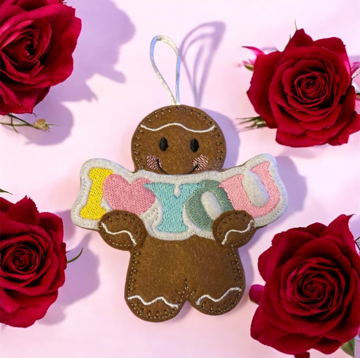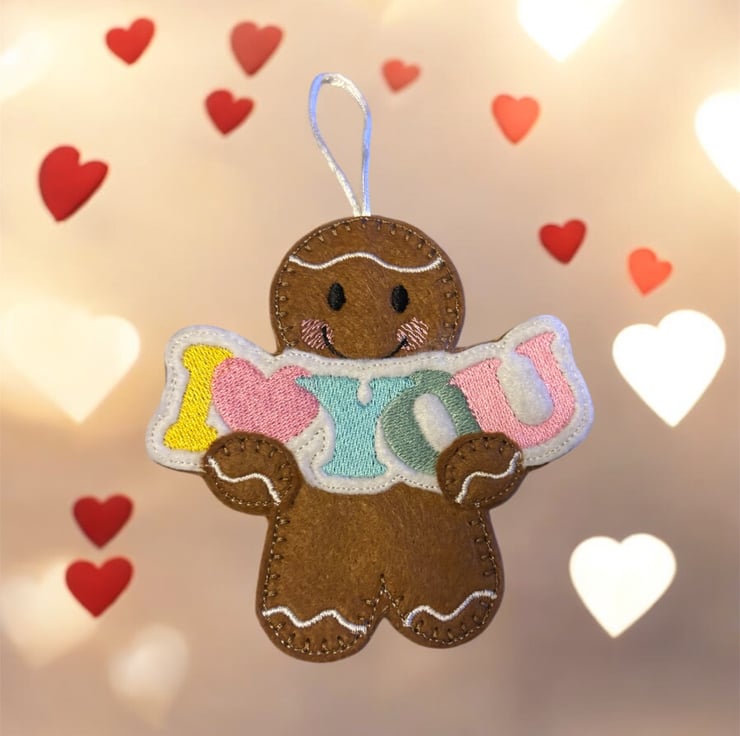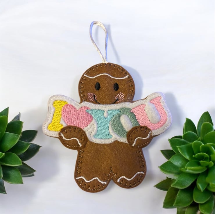 Gingerbread person holding I love you banner Embroidered Hanging Keepsake