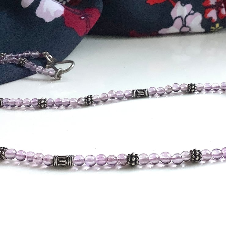 Dainty Amethyst necklace with silver spacer beads and chunky silver hook fastening. I have used oxidised silver beads give this necklace a vintage effect. 53 cm including hook