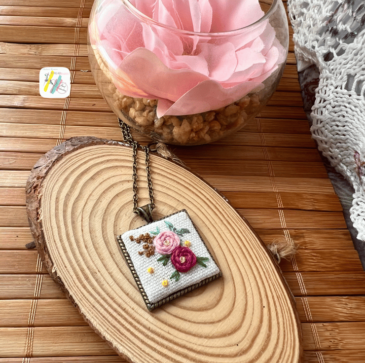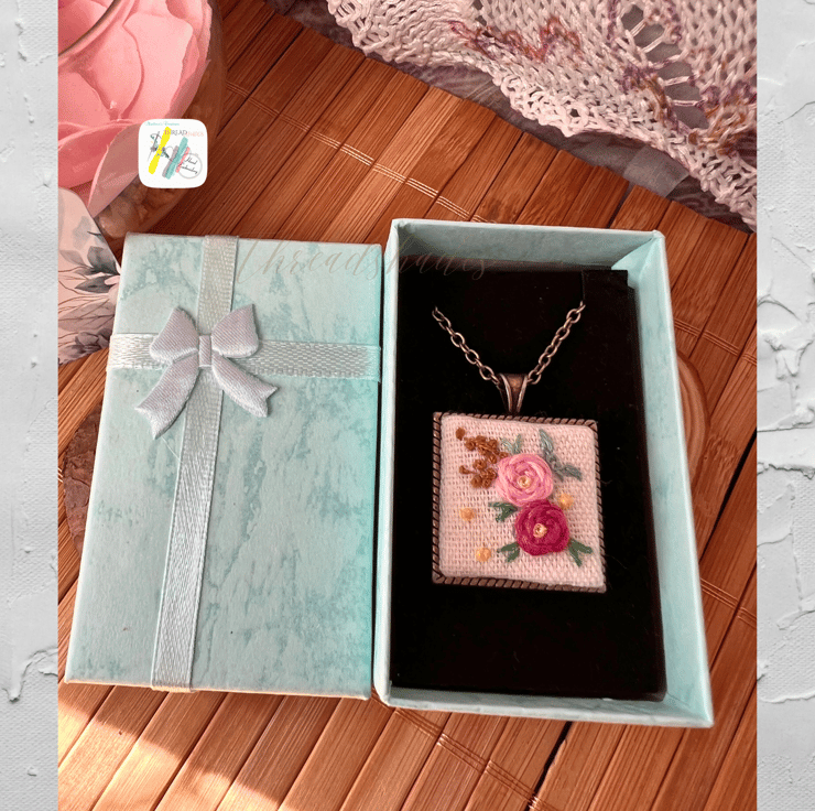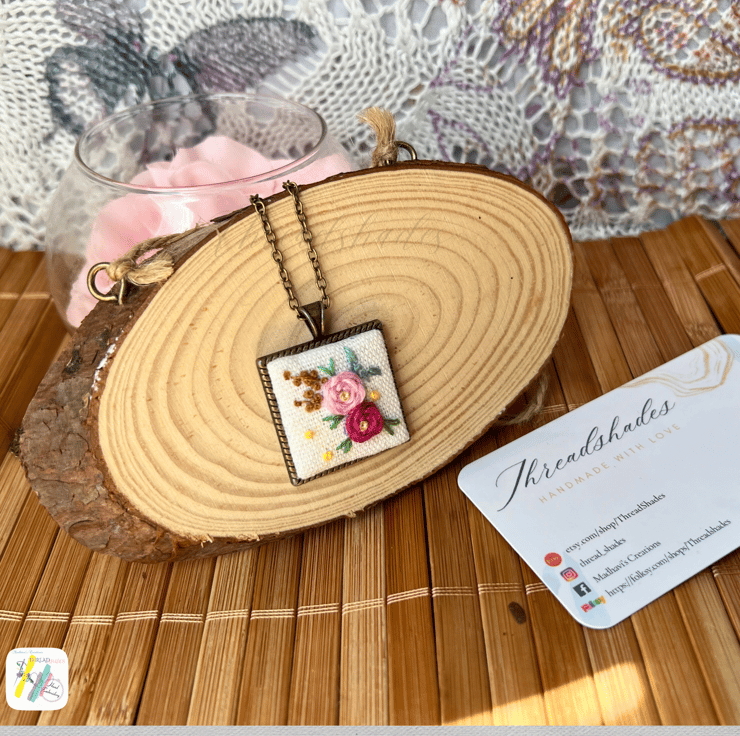 Details:- This handmade pendant is designed and created with beautiful embroidery work. Floral design using various colours on off white colour linen fabric making it look elegant and unique.
