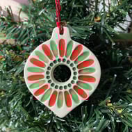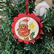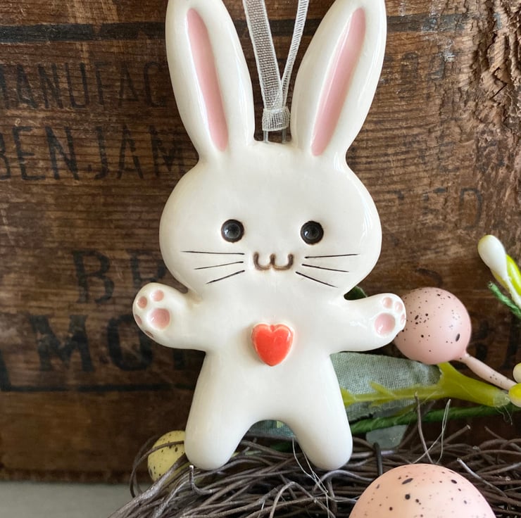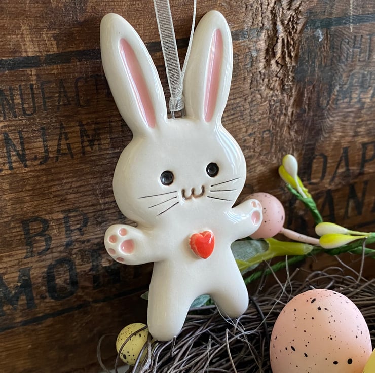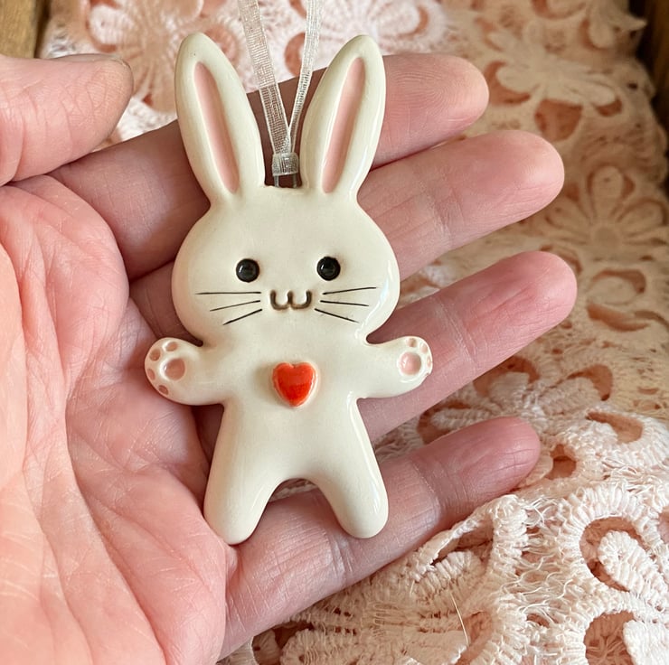 This little bunny has been completely designed by me from start to finish. He has been cut from white earthenware clay, his little paws imprinted and filled with pink glaze. He has been twice fired in an electric kin. He measures 8 cm tall x 4.5c, wide and 1cm deep., He hangs from a matching organza ribbon. It is glazed on the front and left plain on the back.