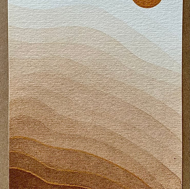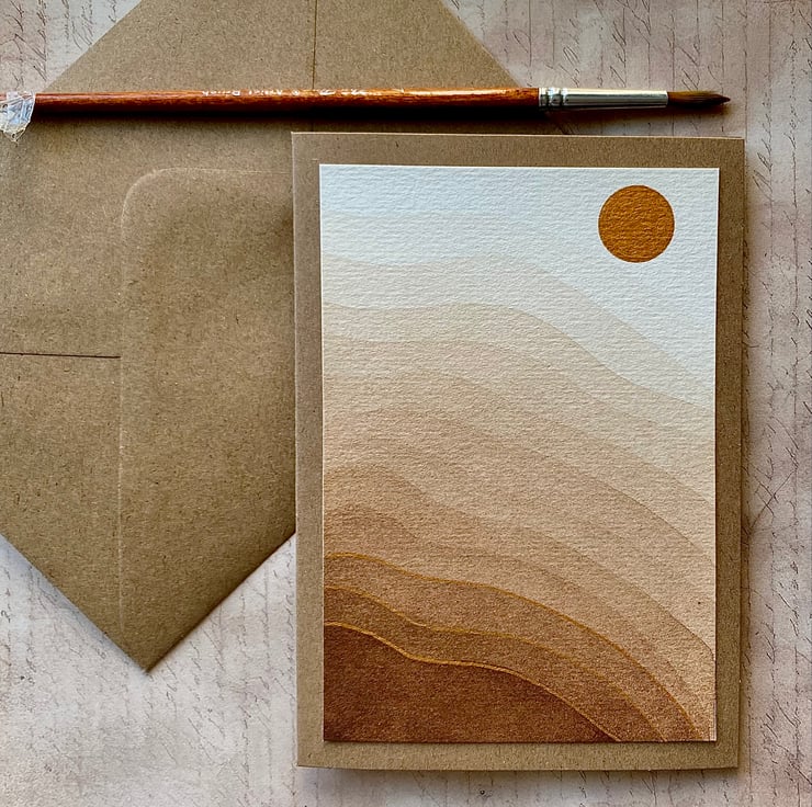 Beautiful hand painted watercolour landscape, blank card. Graduated umber with metallic copper accents and sun. Watercolour paper (300gsm) mounted on high-quality grade A6 300gsm brown kraft card (105 x 148 millimeters) with brown envelope. Eco friendly, acid and lignin free. Made from recycled kraft paper. Blank inside for your own personal message.