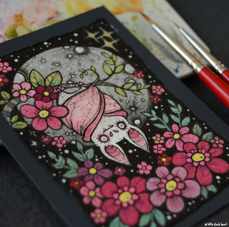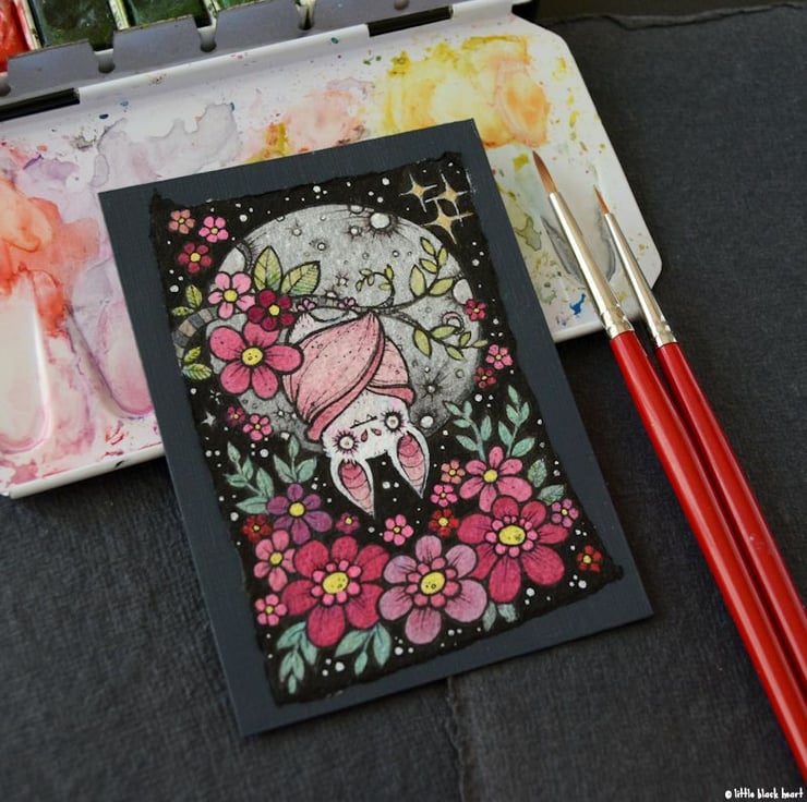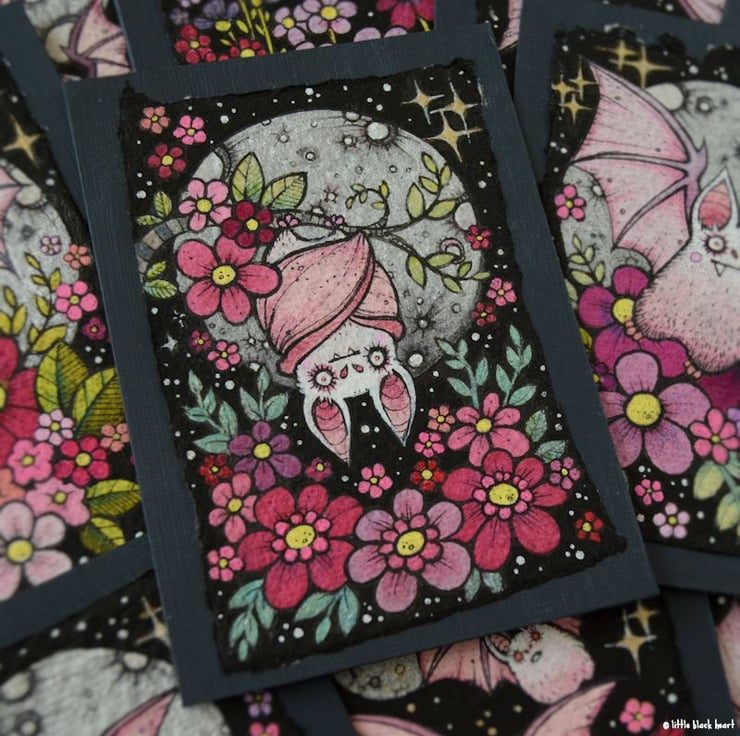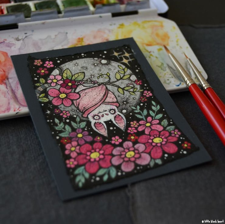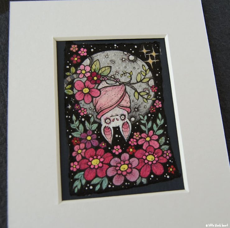 this aceo is an original artwork, hand drawn with a tiny 0.05 nibbed pen, then coloured with ink, artists pens and watercolour paints, on indian khadi paper. khadi paper is handmade from recycled cotton rag, it has a lovely textured surface and deckled edges. i have then mounted the illustration onto 300gsm cardstock, hand painted with a paynes grey to create a dark surrounding edge/background.