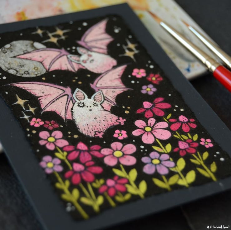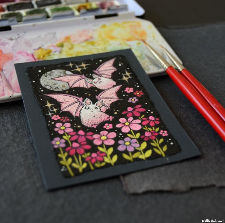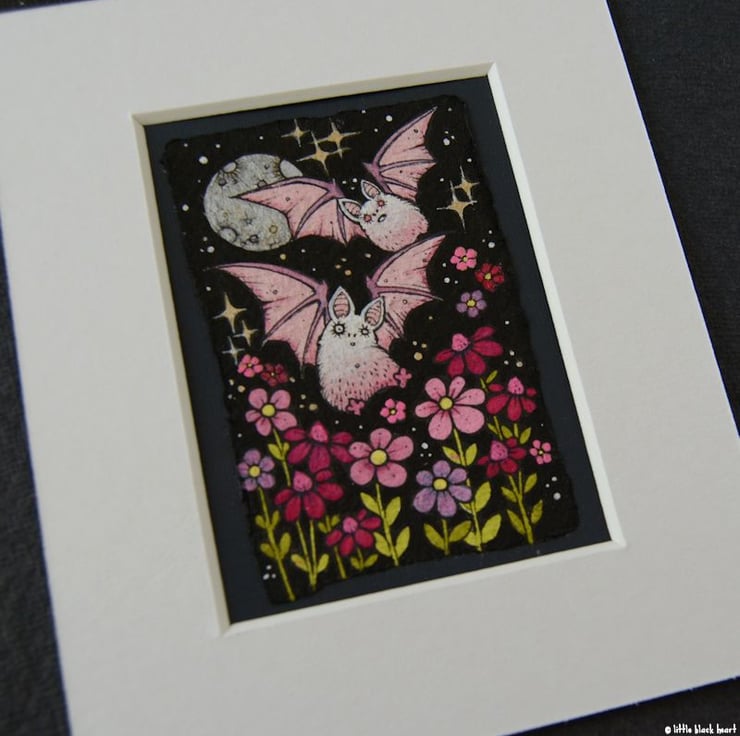 this aceo is an original artwork, hand drawn with a tiny 0.05 nibbed pen, then coloured with ink, artists pens and watercolour paints, on indian khadi paper. khadi paper is handmade from recycled cotton rag, it has a lovely textured surface and deckled edges. i have then mounted the illustration onto 300gsm cardstock, hand painted with a paynes grey to create a dark surrounding edge/background.