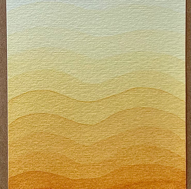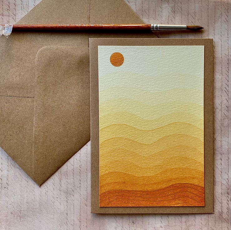 Beautiful hand painted watercolour landscape, blank card. Graduated transparent gold with metallic copper accents and sun. Watercolour paper (300gsm) mounted on high-quality grade A6 300gsm brown kraft card (105 x 148 millimeters) with brown envelope. Eco friendly, acid and lignin free. Made from recycled kraft paper. Blank inside for your own personal message.