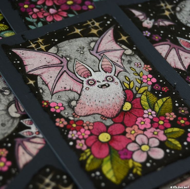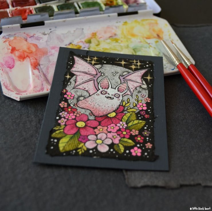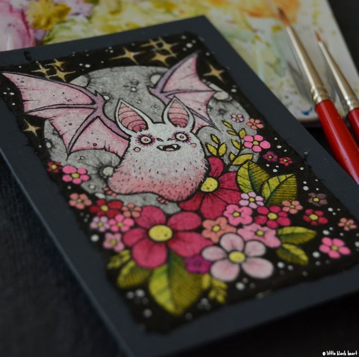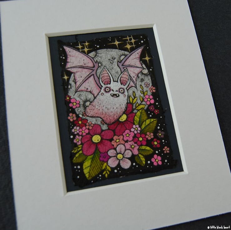 this aceo is an original artwork, hand drawn with a tiny 0.05 nibbed pen, then coloured with ink, artists pens and watercolour paints, on indian khadi paper. khadi paper is handmade from recycled cotton rag, it has a lovely textured surface and deckled edges. i have then mounted the illustration onto 300gsm cardstock, hand painted with a paynes grey to create a dark surrounding edge/background.