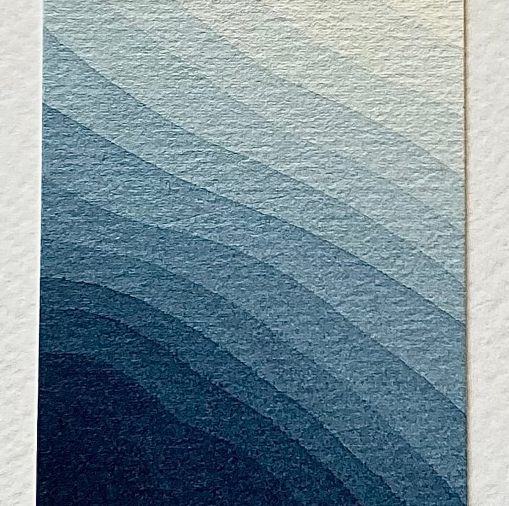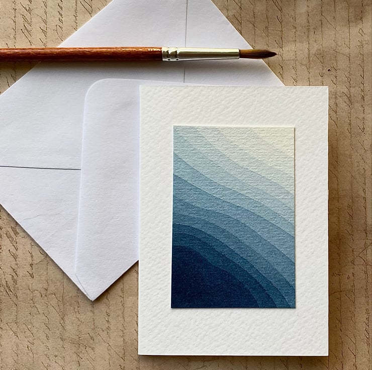 Beautiful hand painted watercolour waves, blank card. Graduated indigo watercolour paint on watercolour paper (300gsm) mounted on white A7 watercolour card with white envelope 105 x 74mm