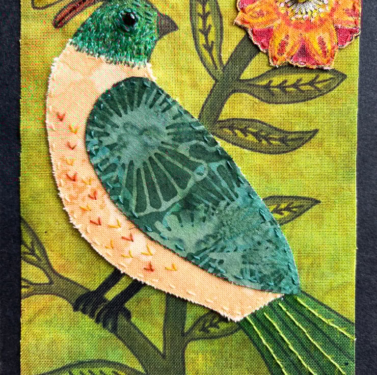 This good quality A5 sketchbook has been decorated with my folk bird design which I had printed onto fabric. I've given the design a wash with acrylic inks and added a flower with seed beads. I've sewn batik fabrics onto the bird's chest and wing, and used embroidery threads to add some texture.