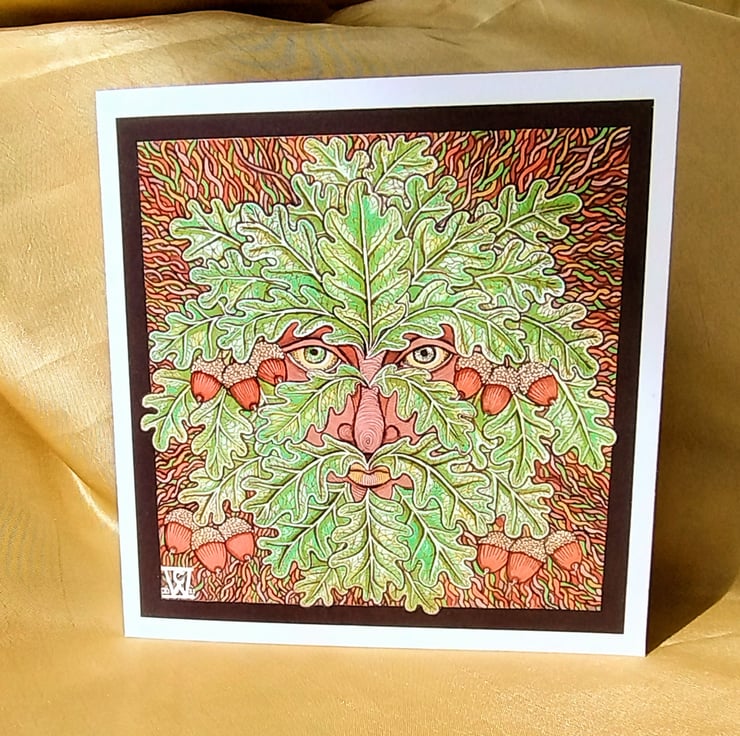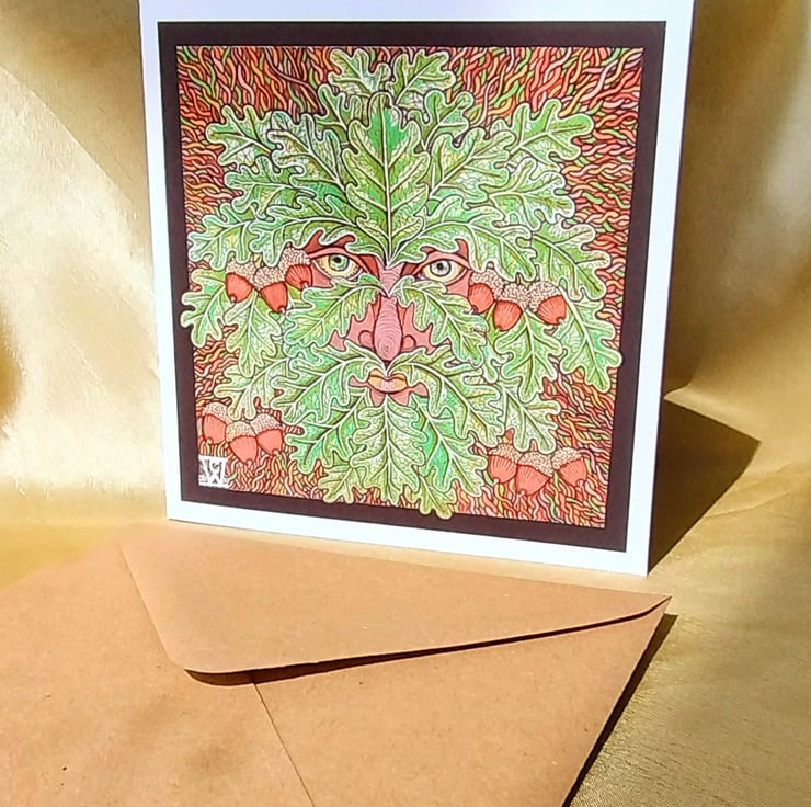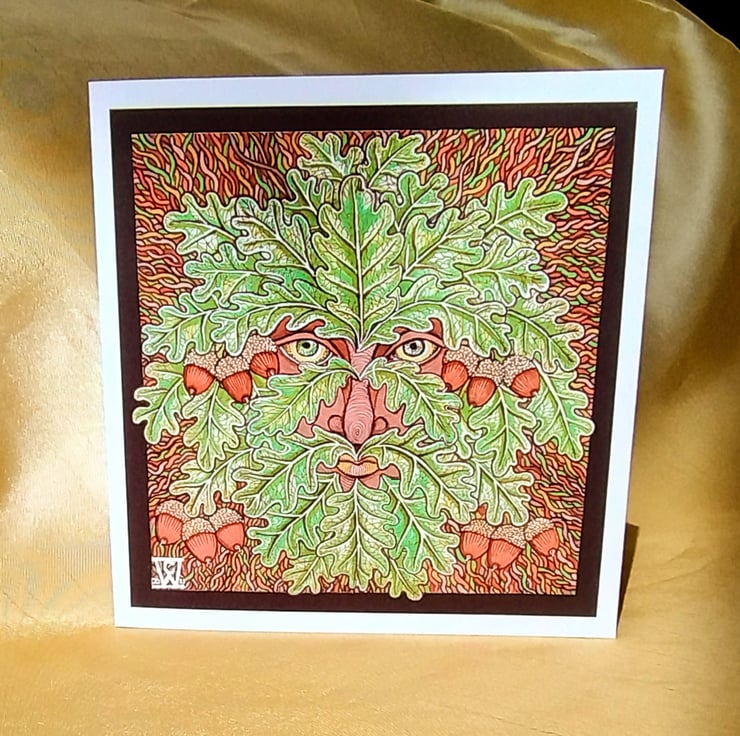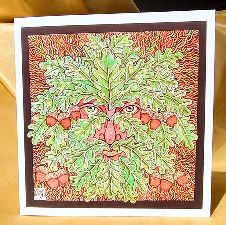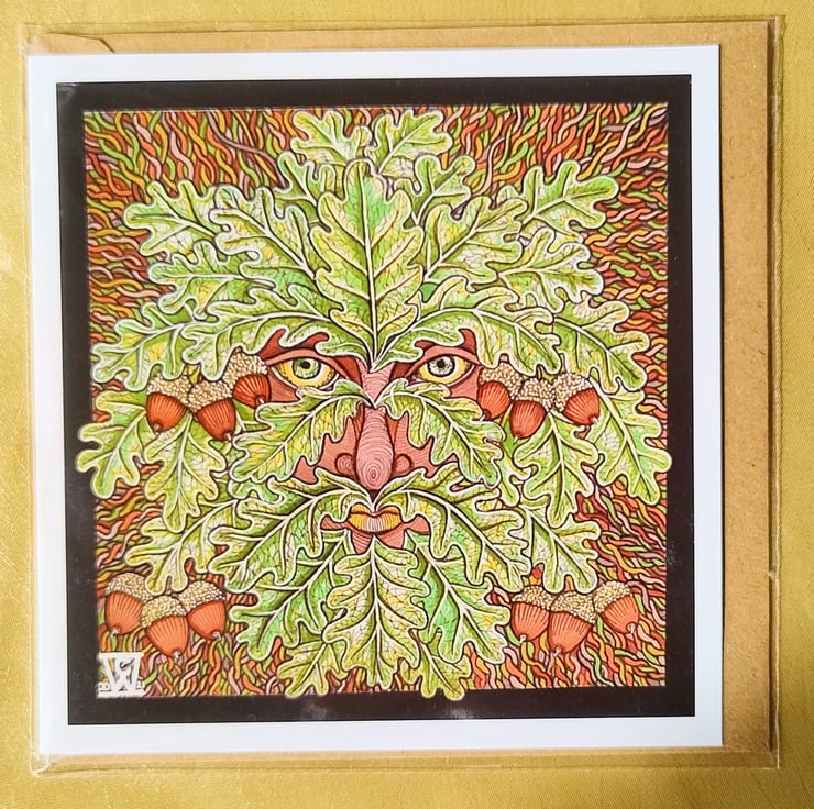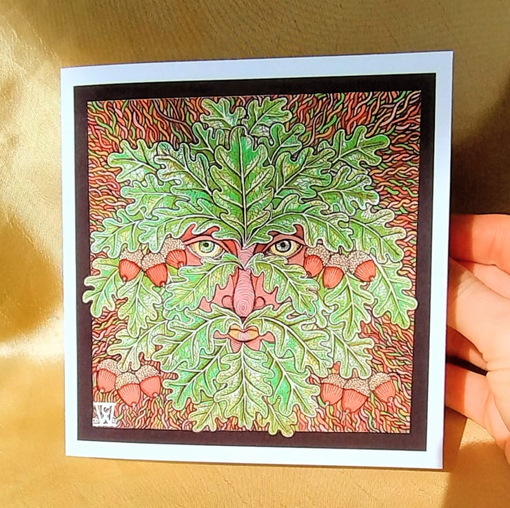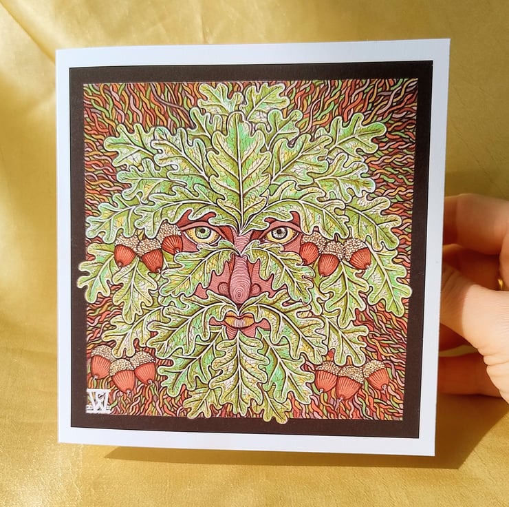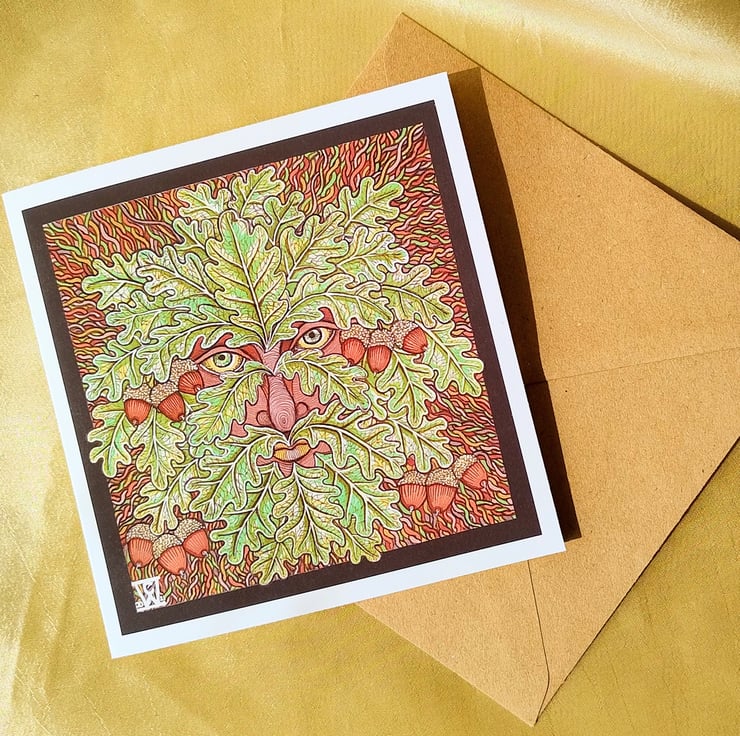 Illustration of the Green Man, drawn using fine liners, gel pens and alcohol markers, printed on a 140 x140 cm greetings card made from matte, 315gsm cotton card.