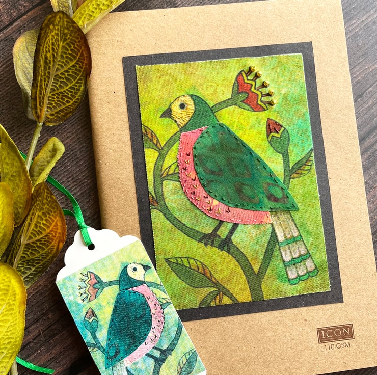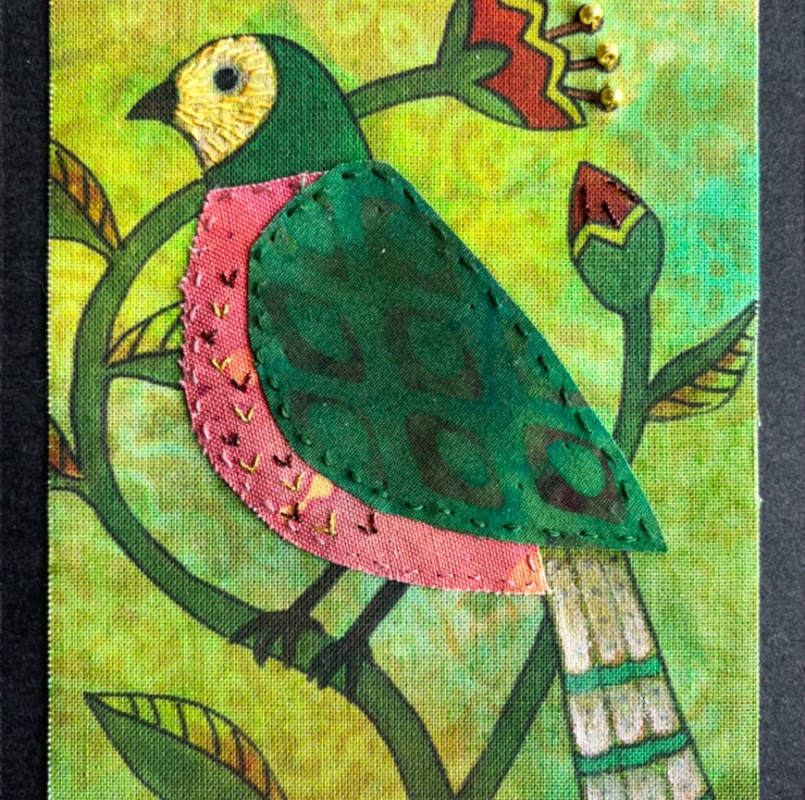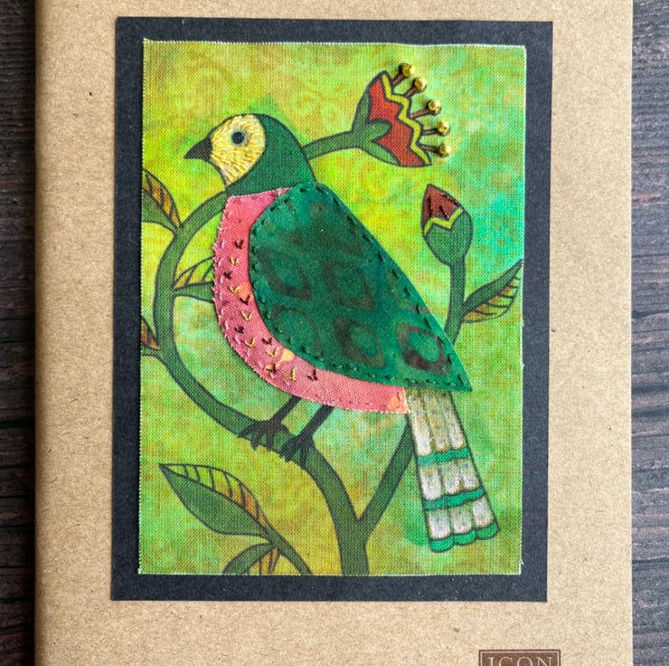 This good quality A5 sketchbook has been decorated with my folk bird design which I had printed onto fabric. I've given the design a wash with acrylic inks and added batik fabrics to the bird's chest and wing. I've used embroidery threads and seed beads to add some texture.
